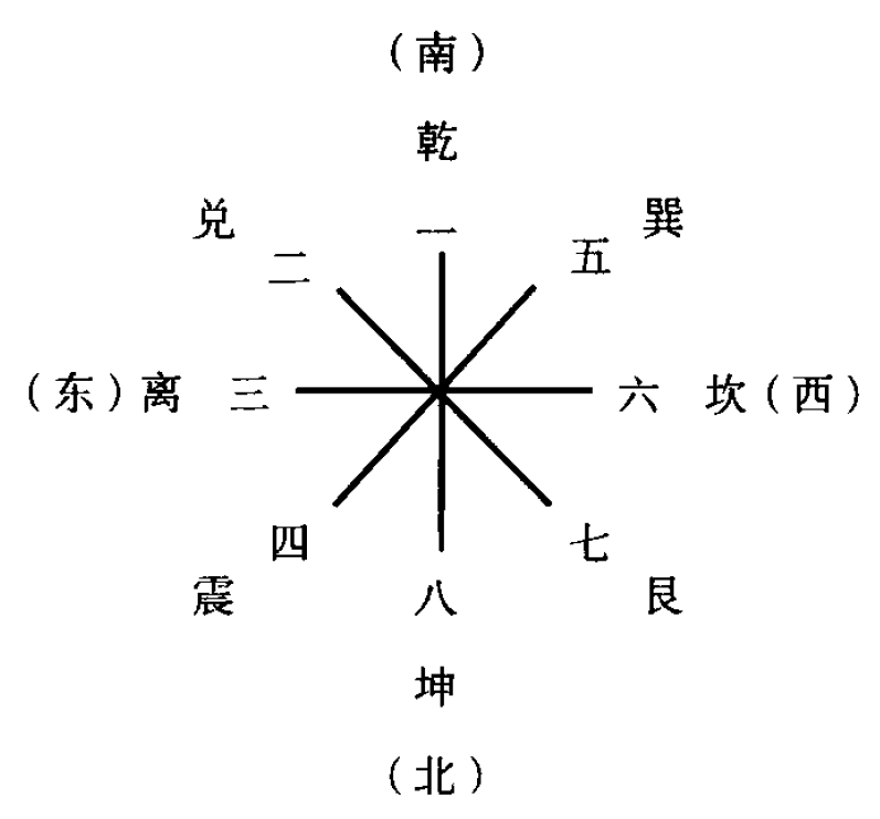 ②八卦的顺数为:乾一,兑二,离三,震四,巽五,坎六,艮七,坤八。这是伏羲氏的先天八卦,其图如下: