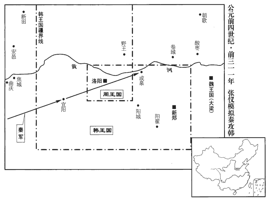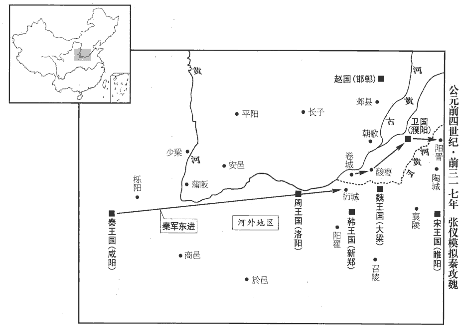 3張儀說魏襄王曰:「梁地方不至千里,卒不過三十萬,地四平,無名山大川之限,卒戍楚、韓、齊、趙之境,戍,舂遇翻;字從「人」,從「戈」,人荷戈,所以戍也。梁地南接楚,西接韓,東接齊,北接趙。守亭、障者不過【章:十二行本「過」作「下」;乙十一行本同;孔本同;張校同。】十萬,說文:亭,民所安定也,道路所舍也。障,堡障也,隔也,塞也,所以隔塞敵人也。梁之地勢固戰場也。夫諸侯之約從,盟于洹水‹河南安阳北安阳河›之上,結為兄弟以相堅也。事見上卷顯王二十六年。夫,音扶。從,子容翻。洹,於元翻。今親兄弟同父母,尚有爭錢財相殺傷,而欲恃反覆蘇秦之餘謀,其不可成亦明矣?大王不事秦,秦下兵攻河外‹黃河以南›,據卷‹河南原阳西›、衍‹河南郑州北›、酸棗‹河南延津›,後漢志:卷縣屬河南郡,酸棗縣屬陳留郡。水經註:河水逕卷縣北,又東至酸棗、延津,二邑皆河津之要也。卷,逵員翻。衍,以善翻。劫衛,取陽晉‹山東鄆城東›,則趙不南,趙不南則梁不北,梁不北則從道絕,從道絕則大王之國欲毋危不可得也。從道,謂約從之路也。從,子容翻。故願大王審定計議,且賜骸骨。」人臣委身以事君,身非我之有矣,故於其乞退也,謂之乞骸骨。骸,戶皆翻。魏王乃倍從約,倍,蒲妹翻。而因儀以請成于秦。張儀歸,復相秦。儀罷秦相相魏,見上卷顯王四十七年。相,息亮翻。