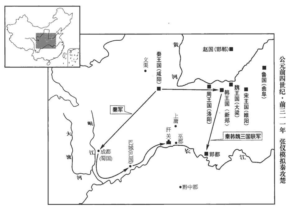 2秦惠王使人告楚懷王,請以武關‹陝西丹鳳縣東南›之外易黔中‹府湖南沅陵,湖南西部及貴州北部›地。武關,左傳之少習,地在漢弘農郡析縣西百七十里,道通南陽。晉太康地志曰:武關當冠軍西。括地志曰:武關在商州上洛縣東。武關之外,蓋秦丹、析、商於之地。黔,音琴。少,始照翻。冠,工玩翻。於,音如字。楚王曰:「不願易地,願得張儀而獻黔中地。」張儀聞之,請行。王曰:「楚將甘心於子,楚王以墮張儀之詐,故欲甘心焉。柰何行?」張儀曰:「秦強楚弱,大王在,楚不宜敢取臣。且臣善其嬖臣靳jìn尚,嬖,匹計翻,又卑義翻。靳,居焮翻,姓也。靳尚得事幸姬鄭袖,鄭,以國為氏。「袖」,戰國策作「褏」,古字也。袖之言,王無不聽者。」遂往。楚王囚,將殺之。靳尚謂鄭袖曰:「秦王甚愛張儀,將以上庸‹湖北竹山›六縣及美女贖之。上庸,春秋庸國。班志,上庸縣屬漢中郡。史記正義:上庸縣,今房州。宋白曰:今房州竹山縣古城,即漢上庸縣。王重地尊秦,秦女必貴而夫人斥矣。」於是鄭袖日夜泣于楚王曰:「臣各為其主耳。為,于偽翻。今殺張儀,秦必大怒。妾請子母俱遷江南,毋為秦所魚肉也。」王乃赦張儀而厚禮之。張儀因說楚王曰:「夫為從者無以異於驅群羊而攻猛虎,不格明矣。說,式芮翻。夫,音扶。從,子容翻。格,當也。劉伯莊曰:格,各額翻,其字宜從「手」。余據字書,格,擊也,闘也,從「木」亦通。今王不事秦,秦劫韓驅梁而攻楚,則楚危矣。秦西有巴‹四川重慶›、蜀‹四川成都›,治船積粟,浮岷江而下,治,直之翻。江水出蜀郡湔氐道之岷山,故謂之岷江。釋名曰:江,共也;小流入其中,所公共也。一日行五百餘里,不至十日而拒【章:十二行本「拒」作「距」;乙十一行本同。】扞關‹重庆奉節东›,徐廣曰:巴郡魚復縣有扞關。史記正義曰:在峽州巴山縣界。扞,寒旦翻。扞關驚則從境以東盡城守矣,境,楚境也。扞關,楚之西境,從境以東,謂扞關以東也。黔中‹湖南沅陵›、巫郡‹重庆巫山縣›非王之有。黔,巨今翻。班志,巫縣屬南郡。酈道元曰:縣故楚之巫郡。杜佑曰:今歸州巴東縣是也。秦舉甲出武關‹陕西丹凤东南›,則北地絕。北地,楚北境之地,陳、蔡、汝、潁是也。秦兵之攻楚也,危難在三月之內。難,乃旦翻。而楚待諸侯之救在半歲之外,夫待弱國之救,忘強秦之禍,此臣所為大王患也。夫,音扶。為,於偽翻。大王誠能聽臣,臣【章:十二行本不重「臣」字;乙十一行本同;孔本同。】請令秦、楚長為兄弟之國,無相攻伐。」令,力丁翻。楚王已得張儀而重出黔中地,重,難也。以地為重,意難割棄之。乃許之。