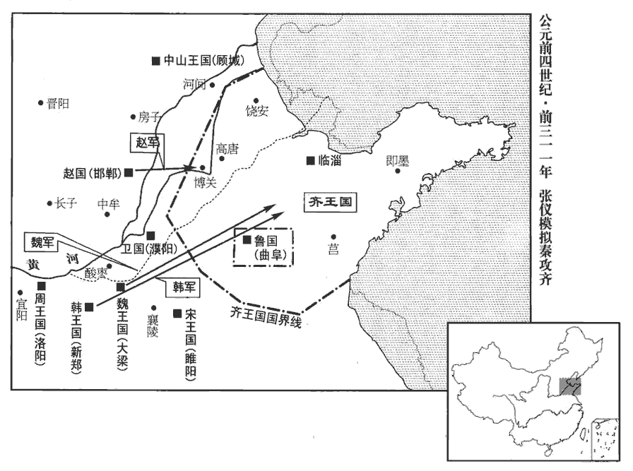 張儀歸報,秦王封以六邑,號武信君。復使東說齊王曰:「從人說大王者復,扶又翻。從人,合從之人也。從,子容翻。說,式芮翻。必曰:『齊蔽于三晉,地廣民眾,兵強士勇,雖有百秦,將無柰齊何。』大王賢其說而不計其實。今秦、楚嫁女娶婦,為昆弟之國;韓獻宜陽;梁效河外‹黄河以南›;河外,秦蓋以河東為河外,梁則以河西為河外,張儀以秦言之也。趙王入朝,割河間‹河北献县›以事秦。朝,直遙翻。河間,趙地。漢文帝二年,分為河間國。應劭曰:在兩河之間。唐為瀛州。大王不事秦,秦驅韓、梁攻齊之南地,漢泰山、城陽,齊南境之地也。悉趙兵,渡清河,指博關‹山東茌平西北›,臨菑‹山东淄博东临淄镇›、即墨‹山東平度›非王之有也!博關在濟州西界之博陵。史記正義曰:博關在博州。趙兵從貝州渡清河指博關,則漯tà河以南臨菑、即墨危矣。濟,子禮翻。漯,託合翻。國一日見攻,雖欲事秦,不可得也!」齊王許張儀。