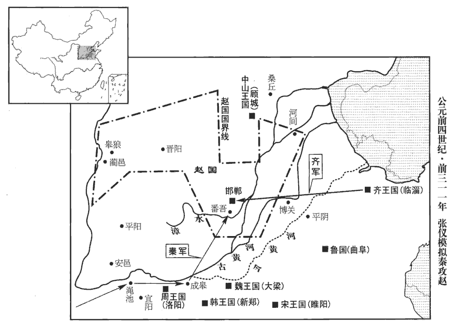 張儀去,西說趙王曰:「大王收率天下以擯秦,秦兵不敢出函谷關‹河南灵宝东北›十五年。擯,必刃翻。事見上卷顯王三十六年。大王之威行于山‹崤山›東,敝邑恐懼,春秋以來,列國交聘,行人率自稱其國曰敝邑。繕甲厲兵,力田積粟,愁居懾處,不敢動搖,懾,之涉翻,怖也,心伏也,失常也,失氣也。處,昌呂翻。唯大王有意督過之也。師古曰:督過,視責也。索隱曰:督者,正其事而責之;督過,是深責其過也。今以大王之力,舉巴、蜀,事見慎靚王五年。并漢中,事見上二年。包兩周,元年服韓、魏,則包兩周矣。守白馬之津‹河南滑縣›。班志,白馬縣屬東郡。水經註:白馬津在白馬城之西北。白馬城,唐為滑州治所。開山圖曰:白馬津東可二十許里,有白馬山,山上常有白馬群行,悲鳴則河決,馳走則山崩,後人因以名縣及津。按通鑑不語怪,今此註亦近于怪,姑以廣異聞耳。秦雖僻遠,然而心忿含怒之日久矣。今秦有敝甲凋兵軍于澠池‹河南澠池›,敝,敗惡也,凋,瘁也,半傷也。敗甲凋兵,謙其辭,言軍于澠池,則張其勢以臨趙矣。康曰:澠池,趙邑。余據趙與韓、魏接境,韓有野王、上党,魏有河東、河內,而澠池則秦地也,漢為縣,屬弘農郡,趙安能越韓、魏而有之!康說非是。澠,莫善翻;又莫忍翻。願渡河,逾漳,據番吾‹河北平山›,言欲自澠池北渡河,又自此東逾漳水而進據番吾,此亦張聲勢以臨趙也。番吾,即漢常山郡之蒲吾縣也。劉昭註曰:史記番吾君,杜預云:晉之蒲邑也。此說非。括地志:番吾故城,在恒州房山縣東二十里。番,音婆,又音盤。會邯鄲之下,願以甲子合戰,正殷紂之事。武王伐紂,癸亥陳于商郊,甲子昧爽,紂帥其旅若林,會於牧野,前徒倒戈,攻其後以北,遂以勝殷殺紂。張儀引以懼趙,其有所侮而動,亦已甚矣。邯鄲,趙都,音寒丹。謹使使臣先聞左右。使臣,上疏吏翻。今楚與秦為昆弟之國,而韓、梁稱東藩之臣,齊獻魚鹽之地,齊東瀕於海,海濱廣斥,魚鹽所出也。此時齊未嘗獻地于秦,張儀駕說以恐動趙耳。此斷趙之右肩也。夫斷右肩而與人斗,夫,音扶。斷,丁管翻。失其党而孤居,求欲毋危得乎!今秦發三將軍,其一軍塞午道,索隱曰:午道當在趙之東,齊之西。午道,地名也。鄭玄云:一縱一橫為午,謂交道也。塞,悉則翻。告齊使渡清河,軍於邯鄲之東,邯鄲,音寒丹。一軍軍成皋‹河南荥阳西北›,驅韓、梁軍於河外‹黄河以南›,史記正義曰:河外,謂鄭滑州,北臨河。余謂此河外,亦因趙而言之。一軍軍于澠池,約四國為一以攻趙,趙服必四分其地。言秦約齊、韓、魏四分趙地。臣竊為大王計,莫如與秦王面相約而口相結,常為兄弟之國也。」趙王許之。當時趙于山東最強,且主從約,張儀說之,亦費辭矣。