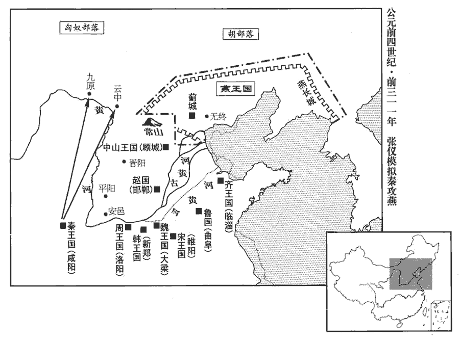 張儀乃北之燕,燕,因肩翻。說燕王曰:「今趙王已入朝,效河間‹河北献县›以事秦。張儀自趙至燕,借此氣勢而為是虛言以動燕耳。朝,直遙翻。大王不事秦,秦下甲雲中‹內蒙托克托›、九原‹內蒙包頭›。虞氏記曰:趙自五原河曲築長城,東至陰山,又於河西造大城,一箱崩不就,乃改卜陰山河曲而禱焉,晝見群鵠游於雲中,徘徊經日,見大光在其下,乃即其處築城,今雲中城是也。余謂此亦語怪,酈道元為後魏書之耳。宋白曰:勝州榆林縣界有雲中古城,趙武侯所築,秦置雲中郡,唐為單于都護府。班志:九原縣屬五原郡。漢之五原,即秦之九原郡也。唐為豐、鹽等州之地。宋白曰:唐豐州治九原縣。按雲中、九原,皆在燕之西,秦自上郡朔方下兵則可至。史記正義曰:古雲中、九原郡皆在勝州。雲中郡故城在榆林東北四十里。九原郡故城在勝州西界,今連谷縣是。下,遐稼翻。元為,於偽翻。驅趙而攻燕。則易水、長城非大王之有也!水經註:易水出涿郡故安縣閻鄉西山,東屆關城西南,即燕長城門也。易水又歷長城而東過范陽、容城、安次、泉州縣南而東入海。且今時齊、趙之于秦,猶郡縣也,不敢妄舉師以攻伐。今王事秦,長無齊、趙之患矣。」以利動之。燕王請獻常山‹恒山,山西灵丘南›之尾五城以和。常山,即北嶽恒山也。漢文帝諱恒,改曰常山,置常山郡。班志,常山在常山郡上曲陽縣西北,其尾則燕之西南界。
