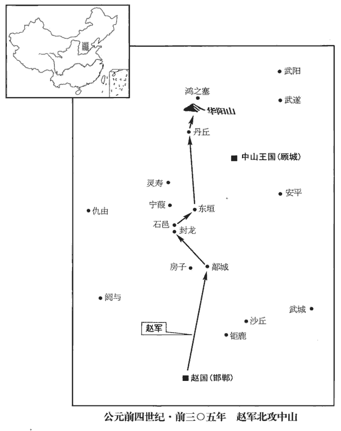 2趙王伐中山‹都顾城,河北定州›,取丹丘‹河北曲陽西北›、爽陽‹河北涞源南›、鴻之塞‹河北涞源南›,又取鄗‹河北柏鄉北›、石邑‹河北石家庄›、封龍‹河北石家庄西南›、東垣yuán‹河北石家庄东北›。史記正義曰:丹丘,邢州縣。余按隋、唐志,邢州有內丘縣,漢之中丘縣也,未嘗有丹丘,不知其何據。「爽陽、鴻之塞,」史記作「華陽、鴟chī之塞」。括地志曰:北嶽別名曰華陽臺,即常山也,在定州恒陽縣北百四十里。徐廣曰:「鴟」作「鴻」,鴻上故關,今名汝城,在定州唐縣東北六十里。又有鴻上水,出唐縣北葛洪山,山接北嶽恒山,皆在定州界。班志,石邑縣屬常山郡,井陘山在西。括地志:石邑故城,在恒州鹿泉縣南三十五里。封龍山,一名飛龍山,在恒州鹿泉縣南四十五里,邑蓋因山為名。洪氏隸釋載後漢所立白石碑云:常山國元氏縣界有封龍山。東垣,即漢真定國之真定縣,漢高帝更名。史記正義曰:趙之東垣,在恒州真定縣南八里,故常山城是也。鄗,呼各翻。垣,於元翻。華,戶化翻。恒,戶登翻,鴟,丑之翻。陘,音刑。更,工衡翻。中山獻四邑以和。