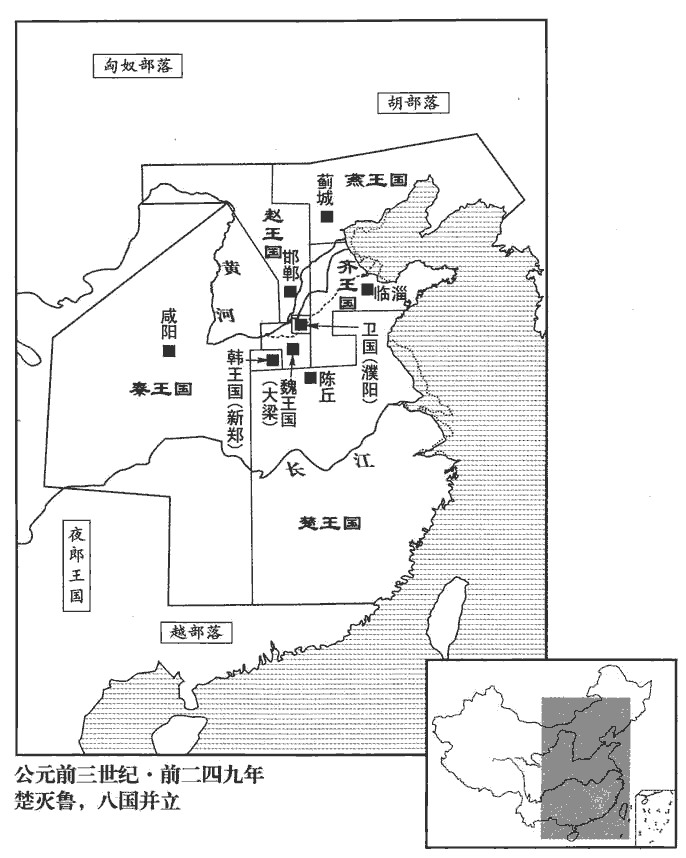 5楚‹都陈丘,河南淮阳›滅魯‹府莒城,山东莒县›,遷魯頃公‹雠›于卞‹山東泗水縣›,春秋:「夫人姜氏會齊侯于卞,」即其地。班志,卞縣屬魯郡。頃,音傾。為家人。家人,猶今所謂齊民也。