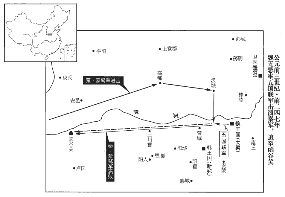 〖译文〗 [2]秦将蒙骜率军进攻魏国,占领了高都和汲。魏军屡战屡败,魏安王为此而忧虑,便派人到赵国请信陵君魏无忌回国。信陵君惧怕归国后被判罪,不肯返回,并告诫他的门客们说:“有胆敢给魏国使者通报消息的,处死!”于是,宾客们都不敢规劝他。毛公、薛公为此拜见信陵君说:“您所以受到各国的敬重,只是因为强大的魏国还存在。现在魏国的情势危急,而您却毫不顾惜,如此,一旦秦国人攻陷了国都大梁,将先王的宗庙铲为平地,您当以何面目立在天下人的面前啊!”二人的话还未说完,信陵君已脸色大变,即刻驾车赶回魏国。魏王见到信陵君后握着他的手啜泣不止,随即便任命他为上将军。信陵君派人向各诸侯国求援,各国听说信陵君重又担任魏国的大将,都纷纷派兵援救魏国。信陵君率领五国联军在黄河以西击败蒙骜的军队,蒙骜带残部逃崐走。信陵君督师追击到函谷关,将秦军压制在关内后才领兵还魏。