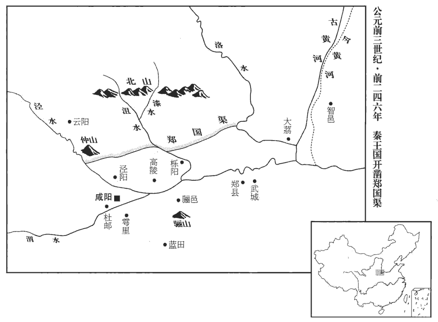 2韓欲疲秦人,使無東伐,乃使水工鄭國為間于秦,鑿涇水自仲山‹陝西泾阳西北境›為渠,間,古莧翻。班志:涇水出安定郡涇陽縣西幵jiān頭山,東至馮翊陽陵縣入渭,過郡三,行千六十里。淮南子曰:涇水出薄落之山。華戎對境圖:涇水上接蔚茹水,南流至筓頭山,西折而東流,逕原州、涇州界,又東流逕邠州、乾州之北,又東南流至雍州涇陽縣而合於渭。師古曰:仲山,即今九嵕之東仲山也。幵,輕煙翻。蔚,紆勿翻。筓,古兮翻。雍,於用翻,嵕,祖紅翻。并北山,東注洛。并,步浪翻。師古曰:洛水,即馮翊漆、沮水。程大昌曰:禹貢止有漆、沮,秦、漢以來始有洛水。所謂洛者,班志云:源出北地歸德縣北蠻夷中。今按其水自入塞後,歷鄜fū、坊、同三州始入渭,孔安國謂自馮翊懷德縣入渭是也。漢懷德、唐同州朝邑縣是也。漆水自華原縣東北同官縣界來,沮水自邠州東北來,洛在漆、沮之東,至同州白水縣與漆、沮合。所謂洛即漆、沮者,言其本同也。沮,七餘翻。鄜,音膚。邠,彼巾翻。中作而覺,師古曰:中作,謂用功中道,事未竟也。覺,露也,韓之謀露也。秦人欲殺之。鄭國曰:「臣為韓延數年之命,然渠成,亦秦萬世之利也。」乃使卒為之。臣為,於偽翻。卒,子恤翻,終也。注填閼之水溉舄xì鹵之地四萬餘頃,收皆畝一鐘,師古曰:注,引也。填閼,謂壅泥也。言引淤濁之水灌鹹鹵之田,更令肥美,故一畝之收至六斛四斗。杜佑曰:古者百步為畝,秦、漢以降,即二百四十步為畝。閼,讀曰淤,音於據翻。舄,與潟同,音思積翻,鹵也。鹵,亦作滷,音郎古翻,鹹滷。關中由是益富饒。饒,有餘裕也。