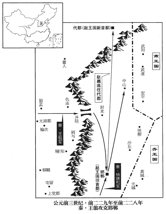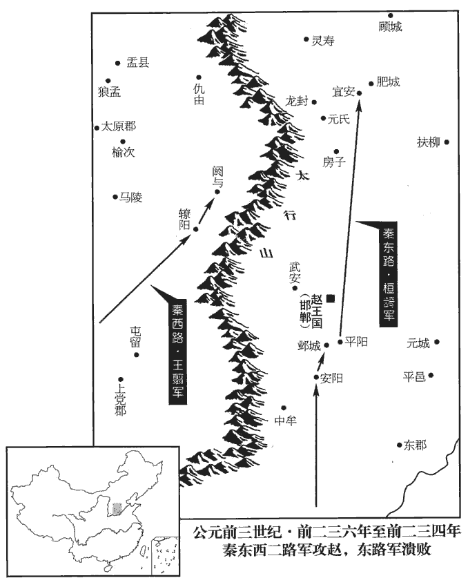 1趙人伐燕,取貍陽‹河北任丘东北›。史記正義曰:按燕無貍陽,疑「貍」字誤,當作「漁陽」,故城在檀州密雲縣南十八里,燕漁陽郡城也。趙東界至瀛州則檀州在北,趙攻燕取漁陽城也。康從本字,力之切。余謂康音是。戰國策,燕昭王攻齊陽城及貍,竊意貍即貍陽也。其地當在齊、燕境上。燕,因肩翻。兵未罷,將軍王翦、桓齮yǐ、楊端和伐趙,言伐燕之兵未罷而秦兵來伐也。姓譜:桓本自姜姓,齊桓公後,因諡為氏。余按齊桓之前有周桓王、魯桓公,晉有桓、莊之族,而以姓桓者為祖齊桓,亦不通矣。齮,丘奇翻,又去倚翻。諡,神至翻。攻鄴‹河北临漳南邺镇›,取九城。王翦攻閼與‹山西和順›、轑lǎo陽‹山西左权›,閼,於曷翻。與,音預,又音餘。徐廣曰:轑,音老,在并州。十三州志:轑陽在上黨西北百八十里,蓋唐樂平郡地,今之遼州也。據十三州志,轑,當音遼。桓齮取鄴‹河北临漳南邺镇›、安陽‹河南安陽›。鄴縣有安陽城,曹魏置安陽縣,屬魏郡。