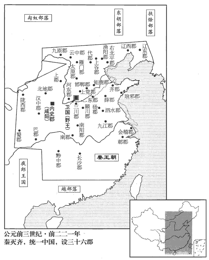 分天下為三十六郡,郡置守、尉、監。裴駰曰:三川‹河南洛阳东白马寺东›、河東‹山西夏县›、南陽‹河南南阳›、南郡‹湖北江陵›、九江‹安徽寿县›、鄣郡‹浙江安吉西北›、會稽‹江苏苏州›、潁川‹河南禹州›、碭郡‹河南商丘›、泗水‹安徽淮北›、薛郡‹山东曲阜›、東郡‹河南濮阳›、琅邪‹山东胶南›、齊郡‹山东淄博东临淄镇›、上谷‹河北怀来›、漁陽‹北京密云›、右北平‹天津蓟县›、遼西‹辽宁义县›、遼東‹辽宁辽阳›、代郡‹河北蔚县›、鉅鹿‹河北平乡›、邯鄲‹河北邯郸›、上黨‹山西长子›、太原‹山西太原›、雲中‹内蒙托克托›、九原‹内蒙包头›、雁門‹山西右玉›、上郡‹陕西榆林南鱼河堡›、隴西‹甘肃临洮›、北地‹甘肃西峰›、漢中‹陕西汉中›、巴郡‹重庆›、蜀郡‹四川成都›、黔中‹湖南沅陵›、長沙‹湖南长沙›,凡三十五郡,與內史‹陕西咸阳›為三十六郡。班書百官表:郡守掌治其郡;郡尉掌佐守典武職、甲卒;監御史掌監郡。守,始究翻。監,去聲;康又居銜切。余謂守、尉、監,官名也,當從去聲;若監郡之監則從平聲。記王制:天子使其大夫為三監,監于方伯之國。陸德明釋文:監,古暫翻;監于,古銜翻;可以知矣。