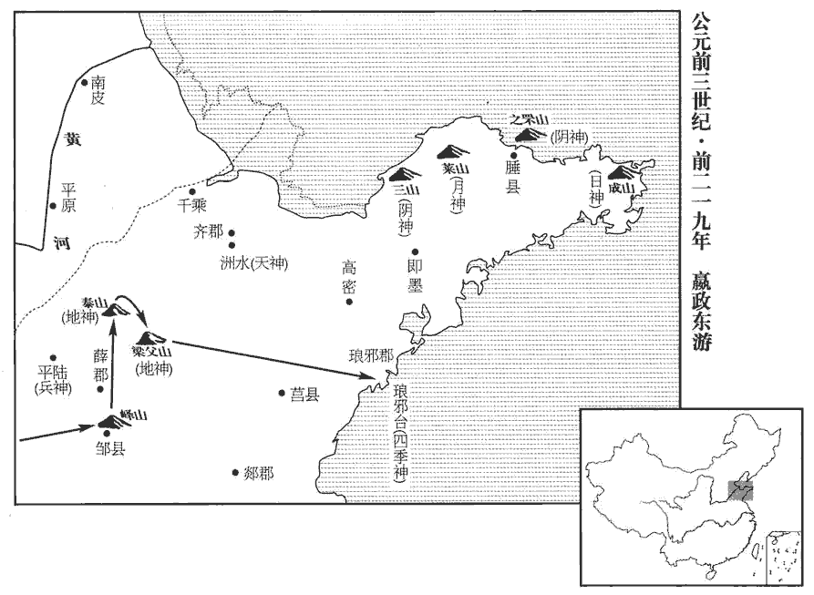 於是始皇遂東遊海上,行禮祠名山、大川及八神。封禪書:八神:一曰天主,祠天齊淵水‹山东淄博临淄南›;二曰地主,祠太山‹山东泰安北›、梁父‹泰安东南›;三曰兵主,祠蚩尤‹平陆,山东汶上县北›;四曰陰主,祠三山‹山东莱州北›;五曰陽主,祠之罘fú山‹山东烟台北芝罘岛›;六曰月主,祠之萊山‹山东龙口东南›;七曰日主,祠成山‹山东荣成东北成山角›;八曰四時主,祠琅邪‹山东胶南南琅邪山›。或曰:八神,齊自太公以來祠之。始皇南登琅邪‹山東膠南縣南›,大樂之,留三月,作琅邪台,立石頌德,明得意。班志,琅邪郡有琅邪縣。山海經:琅邪台在勃海間,琅邪之東。郭璞曰:琅邪臨海邊,有山曰琅邪台。越王句踐徙琅邪,作觀台以望東海。史記曰:始皇徙三萬家於台下。是其所作因越之舊也。括地志:琅邪山在密州諸城縣東南百四十里;始皇立層台於山上,謂之琅邪台。邪,音耶。大樂之,樂琅邪之風景也。樂,音洛。