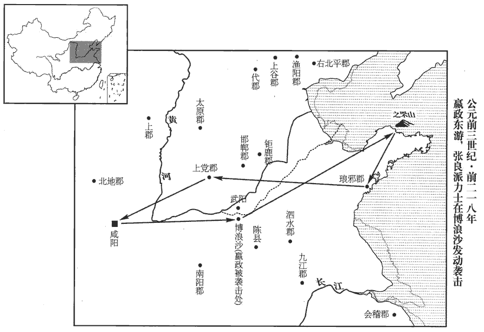 1始皇東游,至陽武‹河南原陽›博浪沙‹河南中牟›中,班志,陽武縣屬河南郡,有博浪沙。索隱曰:今浚儀西北四十里有博浪城。史記正義曰:鄭州陽武縣有博浪沙,當官道。師古曰:「狼」,音浪,史記作「浪」,正義音狼。張良令力士操鐵椎狙擊始皇,誤中副車。狙,玃jué屬。狙之伺物,必伏,乘其便而擊之。狙擊者,謂伏其旁而狙伺以擊之也。狙,千恕翻,又千餘翻。索隱曰:漢官儀:天子有屬車,即副車,奉車即御而從後。余謂副,貳也;漢有五時副車,又在屬車之外。始皇驚,求,弗得;令天下大索十日。索,山客翻。
