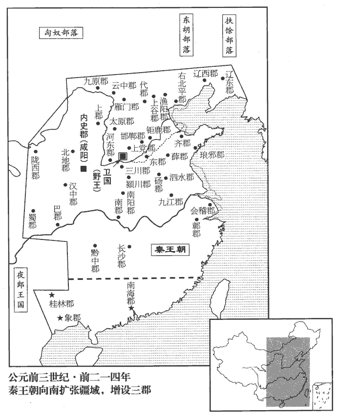 1發諸嘗逋亡人、贅婿、賈人為兵,賈誼曰:秦人家貧子壯則出贅。師古曰:謂之贅婿,言其不當出在妻家,猶人身之有肬贅也。轉貨販易者為商,坐市販賣者為賈。贅,之銳翻。略取南越‹廣東廣西›陸梁地‹五嶺山脈南北,民悍,稱陸上強梁›,索隱曰:謂南方之人,其性陸梁,故曰陸梁地。班表,漢高帝功臣有陸量侯須無,詔以為列諸侯,自置吏令、長,受令長沙王。如淳曰:陸量,秦始皇本紀所謂陸梁地也。置桂林‹廣西百色北›、南海‹廣東廣州›、象郡‹广西崇左›;桂林因產桂而名。合浦以南,山間無雜木,冬夏長青,葉長尺餘。文穎曰:桂林,今鬱林。師古曰:桂林,今桂州界是其地,非鬱林也。南海郡,今廣州。茂陵書曰:象郡治臨塵,去長安萬七千五百里。韋昭曰:今日南是也。以謫徙民五十萬人戍五嶺,與越雜處。所謂謫戍也。晉志曰:自北徂cú南,入越之道,必由嶺嶠;時有五處,故曰五嶺。師古曰:嶺者,西自衡山之南,東窮於海,一山之限耳,而別標名,則有五焉。裴氏廣州記曰:大庾、始安、臨賀、桂陽、揭陽為五嶺。鄧德明南康記曰:大庾嶺,一也;桂陽騎田嶺,二也;九真都龐嶺,三也;臨賀萌渚嶺,四也;始安越城嶺,五也。師古以裴說為是。蜀註曰:大庾嶺在虔州;永明嶺、白芒嶺在道州;臘嶺在郴chēn州;臨源嶺在桂州。謫,則革翻。處,昌呂翻。