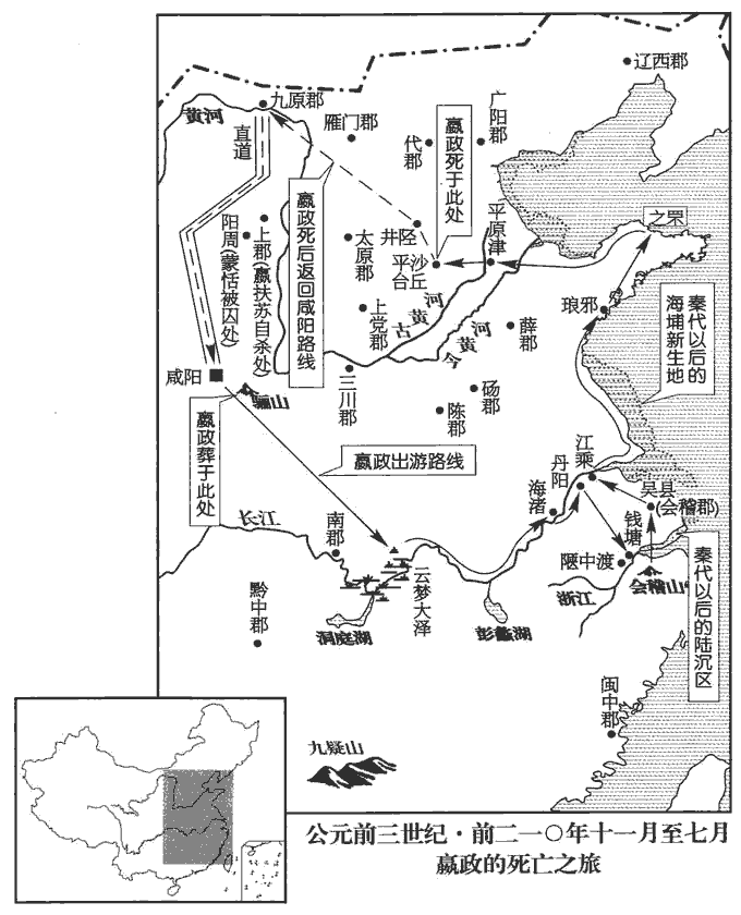 十一月,行至雲夢‹湖北安陸南›,望祀虞舜於九疑山‹湖南寧遠南›。古者,天子巡狩所至,山川之神,各以秩次望祭之。酈道元曰:營水出營陽郡泠道縣南留山,西流逕九疑山。其山磐棋蒼梧之野,峰秀數郡之間,羅岩九舉,各導一溪,岫壑負阻,異嶺同勢,遊者疑焉,故曰九疑。括地志:九疑山在永州唐興縣東南百里,其山九峰相似,故名。元次山曰:九疑山在永州,方四千里,四州各近一隅。九域志曰:九疑在道州,舜陵在女英峰下,九疑之第六峰也。太史公曰:舜南狩,崩於蒼梧之野,歸葬於江南九疑山。山海經曰:舜之所葬,在今道州零陵界。則蒼梧、九疑,兩處也;合而言之者,誤也。浮江下,觀藉柯,渡海渚‹安徽枞阳›,過丹陽‹安徽當塗西北›,至錢唐‹浙江杭州›,史記正義曰:括地志:海渚,云在舒州同安縣東。按舒州在江之中流,疑海字誤。藉,秦昔翻。柯,音歌。班志:丹陽縣,秦屬鄣郡。括地志:丹陽故城,在潤州江寧縣東南五里。班志,錢唐縣屬會稽郡,漢西部都尉所治。唐為杭州治所。臨浙江。水波惡,乃西百二十里,從陿xiá中‹浙江富陽縣,渡富春江›渡。所謂水波惡處,則今之由錢唐渡西陵者是也。西陿中渡,則今富陽、分水之間。徐廣曰:蓋在余杭也。顧夷曰:余杭,秦始皇至會稽經此,立為縣。上會稽‹在浙江紹興南›,班志:會稽山在會稽郡山陰縣南,有禹塚、禹井。祭大禹,望於南海;立石頌德。還,過吳‹江蘇蘇州›,從江乘‹江蘇南京东北›渡。江乘縣,秦屬鄣郡,漢屬丹陽郡。括地志:江乘故縣城在今潤州句容縣北六十里。并海上,北至琅邪‹山東膠南›、之罘‹山東煙臺北芝罘岛›。并,步浪翻。罘,音浮。見巨魚,射殺之。遂并海西,至平原津‹山東平原西南古黄河渡口›而病。平原縣,秦屬齊郡,漢分置平原郡。史記正義曰:今德州平原縣南六十里有張公故城,城東有津,後名張公渡,恐此平原郡古津也。漢書平津侯公孫弘所封亦近此,蓋平津即此津。余按公孫弘傳:封勃海高城縣之平津鄉,則平津非平原津也。班志:篤馬河至平原東北入海。此蓋津渡處。射,而亦翻。并,步浪翻。