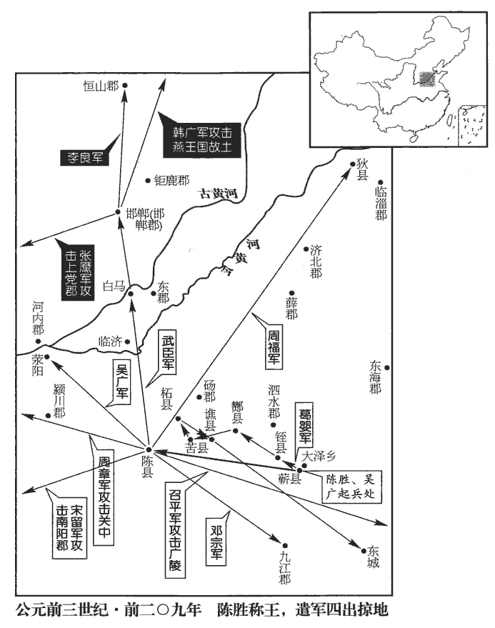 〖译文〗 [3]秋季,七月,阳城人陈胜、阳夏人吴广在蕲县聚众起兵。当时,秦王朝征召闾左贫民百姓往渔阳屯戍守边,九百人途中屯驻在大泽乡,陈胜、吴广均被指派为屯长。恰巧遇上天降大雨,道路不通,推测时间已无法按规定期限到达渔阳防地。而按秦法规定,延误戍期,一律处斩。于是陈胜、吴广便趁着天下百姓生计愁苦、对秦的怨恨,杀掉押送他们的将尉,召集戍卒号令说:“你们都已经延误了戍期,当被杀头。即使不被斩首,因长久在外戍边而死去的本来也要占到十之六七。何况壮士不死则已,要死就图大事!王侯将相难道是天生的吗!”众人全都响应。陈胜、吴广便诈以已死的扶苏和故楚国的大将项燕为名,培土筑坛,登到上面宣布誓约,号称“大楚”。陈胜自立为将军,吴广为都尉。起义军随即攻陷大泽乡,接着招收义兵扩军,进攻蕲。蕲夺取后,即令符离人葛婴率军攻掠蕲以东地区,相继攻打、、苦、柘、谯等地,全都攻下了。义军沿路招收人马,等到抵达陈地时,已有战车六七百辆,骑兵千余,步兵数万人。当攻打陈城时,郡守和郡尉都不在,只有留守的郡丞在谯楼下的城门中抵抗义军,不能取胜,郡丞被打死。陈胜于是领兵入城,占据了陈地。