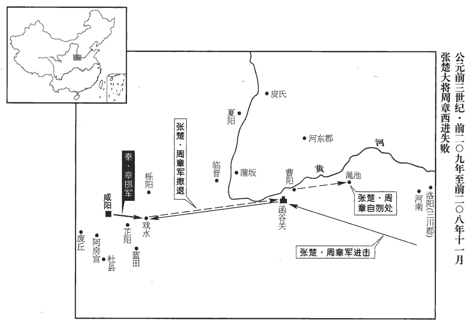 周文行收兵至關‹函谷关,河南灵宝东北›,車千乘,卒數十萬,至戲‹陝西臨潼東北›,軍焉。師古曰:戲,水名,在京兆新豐東;今有戲水驛。其水本出藍田北界,至此而北流入渭。蘇林曰:戲在新豐東南三十里。戲,許宣翻。二世乃大驚,與群臣謀曰:「柰何?」少府章邯曰:班表曰:少府,秦官,掌山林、池澤之賦以給共養。姓譜:齊人降鄣,子孫去邑為章氏。少,詩照翻。邯,下甘翻。「盜已至,眾強,今發近縣,不及矣。驪山‹陕西临潼西南›徒多,秦之刑徒已論者,輸作驪山。請赦之,授兵以擊之。」二世乃大赦天下,使章邯免驪山徒、人奴產子,悉發以擊楚軍,大敗之。服虔曰:人奴產子,家人之產奴。師古曰:奴產子,猶今人云家生奴。仲馮曰:人奴一物,產子又一物。臣瓚曰:人奴之產子,今田客家兒。周文走。