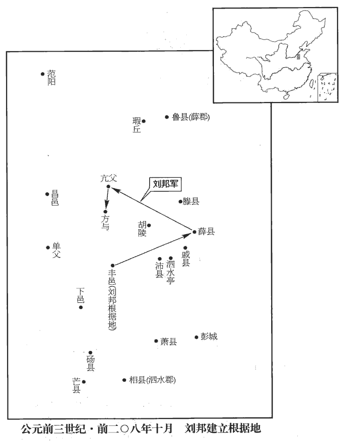 沛公與良俱見景駒,欲請兵以攻豐‹江蘇豐縣›。時章邯司馬𡰥rén將兵北定楚地,師古曰:𡰥rén,古夷字。類篇曰:古仁字;又延知翻。屠相‹安徽淮北›,至碭‹河南永城›。班志,相縣為沛郡治所。括地志:故相城,在徐州符離縣西九十里。相,息亮翻。碭,徒郎翻。東陽寧君、沛公引兵西,與戰蕭西‹安徽蕭縣西›,班志,蕭縣屬沛郡;唐屬徐州。蕭西,謂在蕭縣之西。不利,還,收兵聚留。二月,攻碭,三日,拔之;收碭兵得六千人,與故合九千人。三月,攻下邑‹安徽砀山›,拔之;班志,下邑縣屬梁國。還擊豐‹江蘇豐縣›,不下。