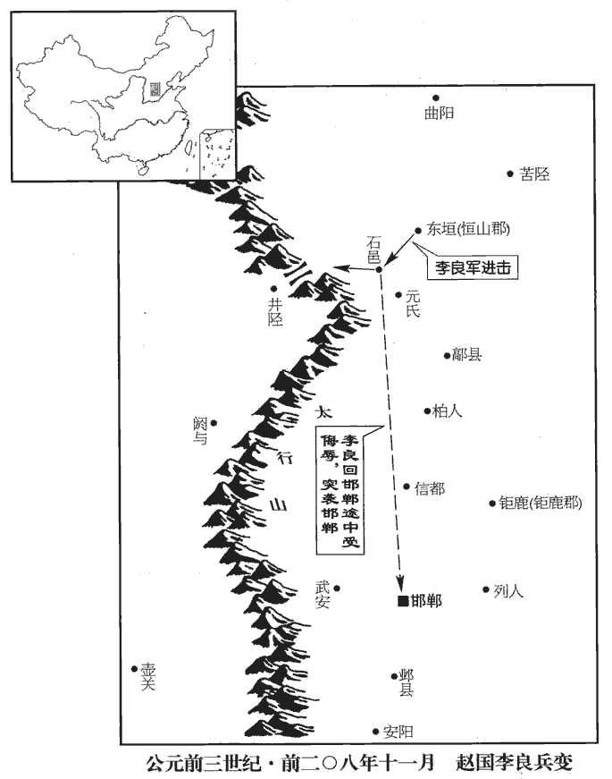 4趙李良已定常山‹河北正定›,去年,趙王使李良略常山。還報趙王。趙王復使良略太原‹山西太原›;至石邑‹河北石家庄西南›,秦兵塞井陘‹河北井陘›,未能前。班志,石邑縣屬常山郡,井陘山在西。塞,悉則翻。陘,音刑。秦將詐為二世書以招良。良得書未信,還之邯鄲‹河北邯鄲›,益請兵。未至,道逢趙王姊出飲,【章:十二行本「飲」下有「從百餘騎」四字;乙十一行本同;孔本同;張校同;退齋校同。】良望見,以為王,伏謁道旁。王姊醉,不知其將,將,即亮翻。使騎謝李良。李良素貴,起,慚其從官。拜謁而起,顧從官而慚也。從,才用翻。從官有一人曰,「天下畔秦,能者先立。且趙王素出將軍下,今女兒乃不為將軍下車,請追殺之!」李良已得秦書,固欲反趙,未決;因此怒,遣人追殺王姊,因將其兵襲邯鄲。邯鄲不知,竟殺趙王、邵騷。趙人多為張耳、陳餘耳目者,以故二人獨得脫。以故者,以此故也。