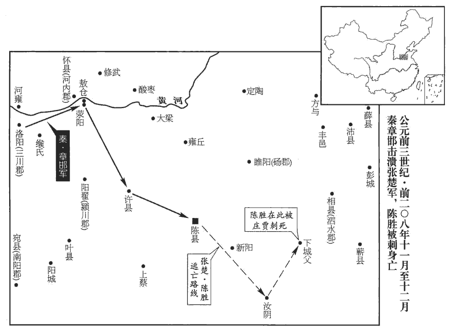 田臧乃使諸將李歸等守滎陽,自以精兵西迎秦軍于敖倉‹河南滎陽北敖山粮仓›,周宣王狩于敖。左傳:晉師在敖、鄗之間。後漢志:滎陽有敖亭,秦立敖倉。孟康曰:敖,地名,在滎陽西北山上,臨河有大倉。與戰;田臧死,軍破。章邯進兵擊李歸等滎陽下,破之,李歸等死。陽城‹河南登封›人鄧說將兵居郯tán,師古曰:郯,東海縣,音談。索隱曰:非也。此時章邯軍未至東海,此郯別是地名;或恐「郯」當作「郟」,郟是郟鄏之地。史記正義曰:郟是春秋時郟地,楚郟敖葬之,今汝州郟縣城‹河南郟縣›是。鄧說,陽城人。陽城,河南府縣,與郟縣相近,又近陳。余按索隱以為河南之郟鄏,正義以為汝州之郟;時章邯兵至滎陽,則已過郟鄏而東矣,正義之說近之。章邯別將擊破之。銍‹安徽宿州西南›人伍逢將兵居許‹河南許昌›,伍,姓也。春秋時,楚有伍舉、伍奢。許,春秋許子之國,班志屬潁川;魏文帝改曰許昌;唐為許州章邯擊破之。兩軍皆散,走陳‹河南淮陽›,陳王誅鄧說。