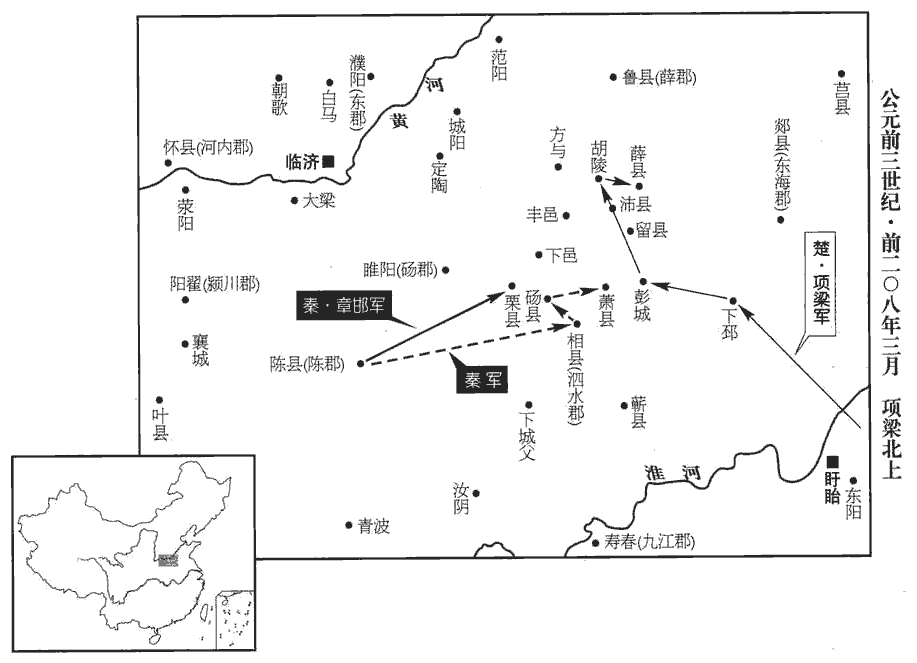 英布既破秦軍,引兵而東;聞項梁西渡淮,布與蒲將軍皆以其兵屬焉。項梁眾凡六七萬人,軍下邳‹江蘇睢宁北›。班志,下邳縣屬東海郡。應劭曰:邳在薛,其後徙此,故曰下邳。臣瓚曰:有上邳,故曰下邳。史記正義曰:下邳,泗水縣也。