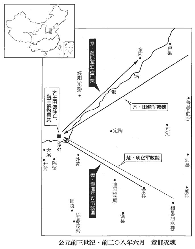 12章邯已破陳王,乃進兵擊魏王於臨濟‹河南封丘东›。後漢志,陳留郡平丘縣有臨濟亭。水經註曰:田儋死處。史記正義曰:今齊州臨濟縣。又曰:故城在淄州高苑縣北二里。余按正義所云臨濟,乃田儋所起狄縣地也,非魏王咎所居臨濟也。後漢志及水經註為是。魏王使周巿出,請救于齊、楚;齊王儋及楚將項它皆將兵隨巿救魏。它,徒河翻,章邯夜銜枚擊,大破齊、楚軍於臨濟下,師古曰:銜枚者,止言語讙huān囂,欲令敵人不知其來也。周官有銜枚氏。枚狀如箸,橫銜之,繣huà結于項。繣結,礙也,絜繞也,蓋為結紐而繞項也。銜,戶緘翻。繣,音獲。絜,音頡。殺齊王及周巿。魏王咎為其民約降;約定,自燒殺。其弟豹亡走楚,楚懷王予魏豹數千人,復徇魏地。為,於偽翻。予,讀曰與。齊田榮收其兄儋余兵,東走東阿‹山東陽谷东北阿城镇›;班志,東阿縣屬東郡。括地志:東阿故城,在濟州東阿縣西南二十五里。章邯追圍之。齊人聞田儋死,乃立故齊王建之弟假為王,田角為相,角弟間為將,以距諸侯。