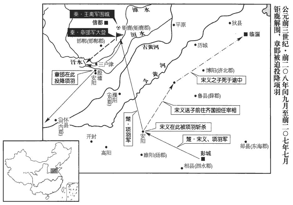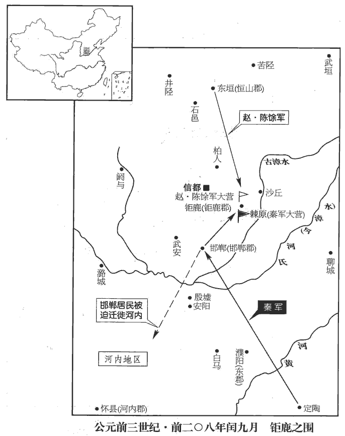 17章邯已破項梁,以為楚地兵不足憂,乃渡河,北擊趙,大破之;引兵至邯鄲,皆徙其民河內‹河南黃河北岸›,夷其城郭。張耳與趙王歇走入鉅鹿城‹河北平鄉›,班志,鉅鹿縣屬鉅鹿郡。應劭曰:鹿,林之大者。臣瓚曰:山足曰鹿。括地志曰:今邢州平鄉城本鉅鹿。宋白曰:十三州志:鉅鹿,堯時大麓之地;禹為大陸之野;秦滅趙,置鉅鹿郡。鉅,亦大稱也。王離圍之。陳餘北收常山‹河北正定›兵,得數萬人,軍鉅鹿北;章邯軍鉅鹿‹河北平鄉›南棘原。趙數請救于楚。數,所角翻;下同。