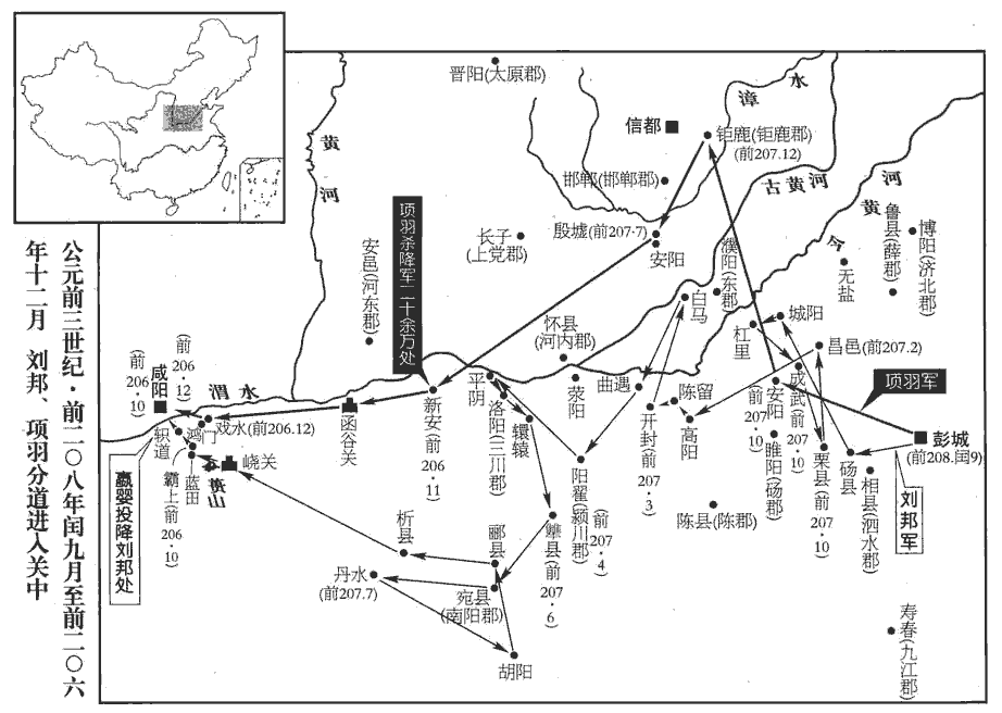 夏,四月,沛公南攻潁川‹河南禹州›,屠之。潁川郡治陽翟。因張良,遂略韓地。文穎曰:河南新鄭南至潁川,皆韓地也。張良家世相韓,故因之。時趙別將司馬卬方欲渡河入關‹函谷關,河南靈寶东北›,沛公乃北攻平陰‹河南孟津›,班志,平陰縣屬河南郡。史記正義曰:今河陰是。絕河津南,戰洛陽東。軍不利,南出轘huán轅‹河南登封西北轘轅关›,後漢志:河南緱氏縣有轘轅關。臣瓚曰:險道名也,在緱氏縣東南。索隱曰:轘轅為九十二曲,是險道也。轘,音環。張良引兵從沛公;沛公令韓王成留守陽翟dí‹河南禹州›,與良俱南。