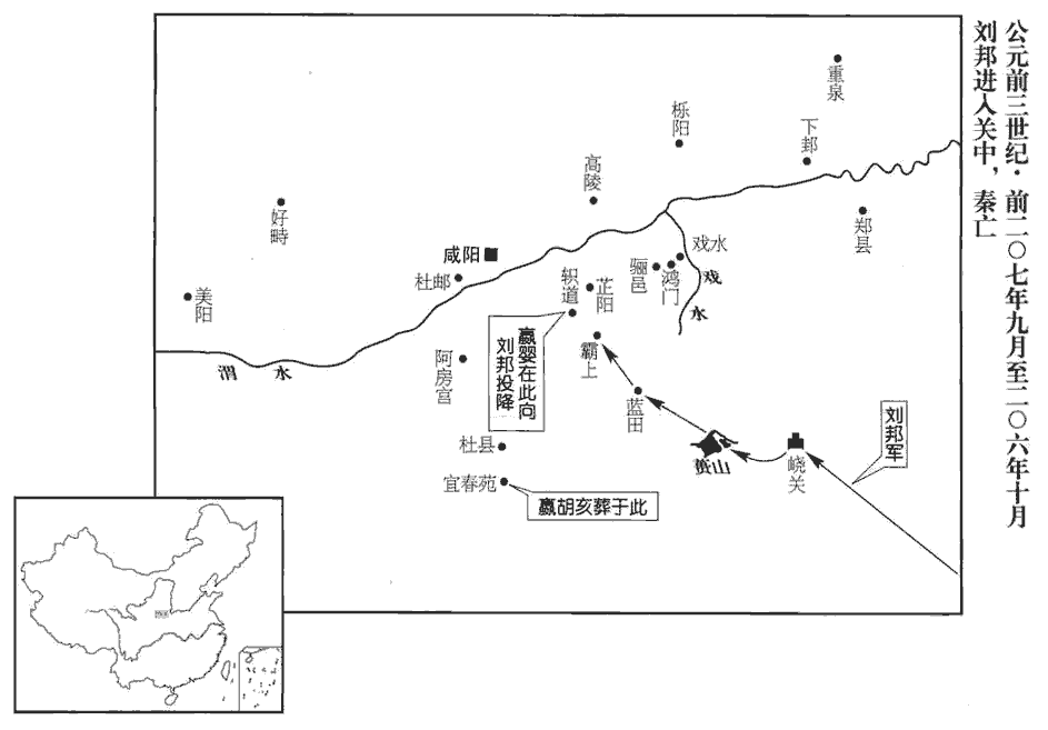 遣將將兵距嶢yáo關‹陝西藍田東南›,應劭曰:嶢山之關。李奇曰:在上洛北,藍田南,武關之西。土地記:嶢關,地名;嶢柳道通荊州。晉地道記曰:嶢關當上洛西北。嶢,音堯。沛公欲擊之。張良曰:「秦兵尚強,未可輕。願先遣人益張旗幟於山上為疑兵,使酈食其、陸賈往說秦將,啖以利。」師古曰:啖者,本為食啖耳,音徒敢翻;以食餧wèi人,令其啖食,音則改變為徒濫翻。今言以利誘之,取食為譬。秦將果欲連和;沛公欲許之。張良曰:「此獨其將欲叛,恐其士卒不從;不如因其懈怠擊之。」沛公引兵繞嶢關,逾蕢kuì山‹陕西蓝田南›,宋敏求長安志曰:嶢關即藍田關,在縣東南九十里。蕢山在縣東南二十五里。蕢,鄭氏音匱;師古從蘇林音蒯。擊秦軍,大破之藍田‹陝西藍田›南。遂至藍田,又戰其北,秦兵大敗。