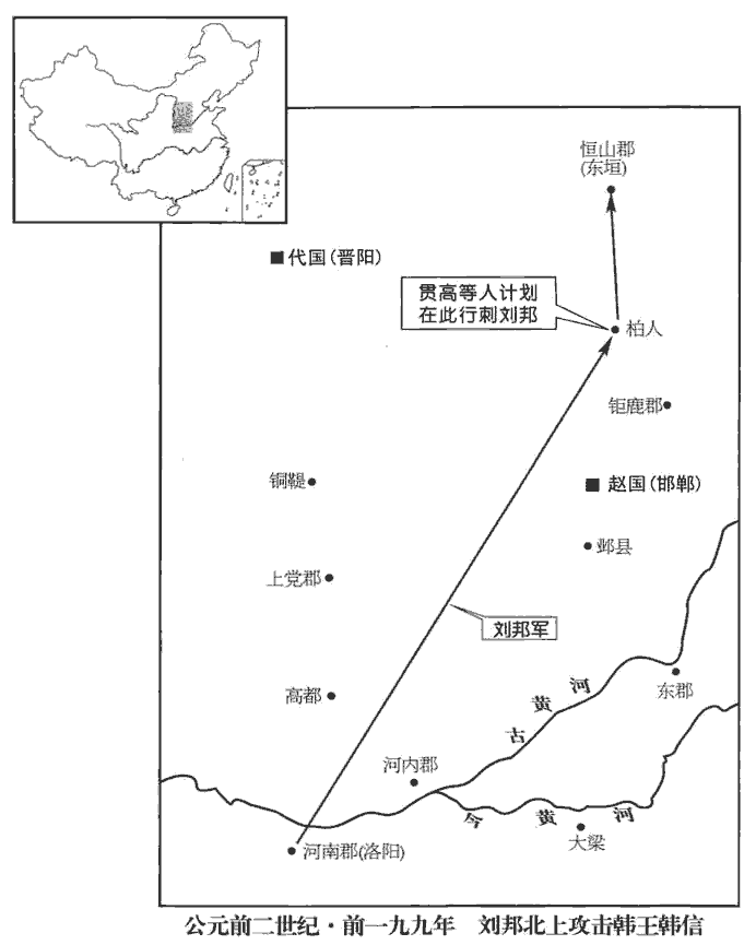 1冬,上‹刘邦,时年五十八›【章︰甲十五行本「上」下有「東」字;乙十一行本同;孔本同。】擊韓王信餘寇於東垣‹河北正定›,班志,高帝十一年,更名東垣曰真定;武帝元鼎四年,置真定國。垣,音轅。過柏人‹河北隆尧西南›。班志,柏人縣屬趙國。括地志:柏人故城,在邢州柏人縣西北十二里;至唐天寶元年,更柏人曰堯山。貫高等壁人於廁中,欲以要上。文穎曰:置人廁壁中以伺高祖也。要,一遙翻。上欲宿,心動,問曰:「縣名為何?」曰:「柏人。」上曰:「柏人者,迫於人也。」遂不宿而去。十二月,帝行自東垣至。