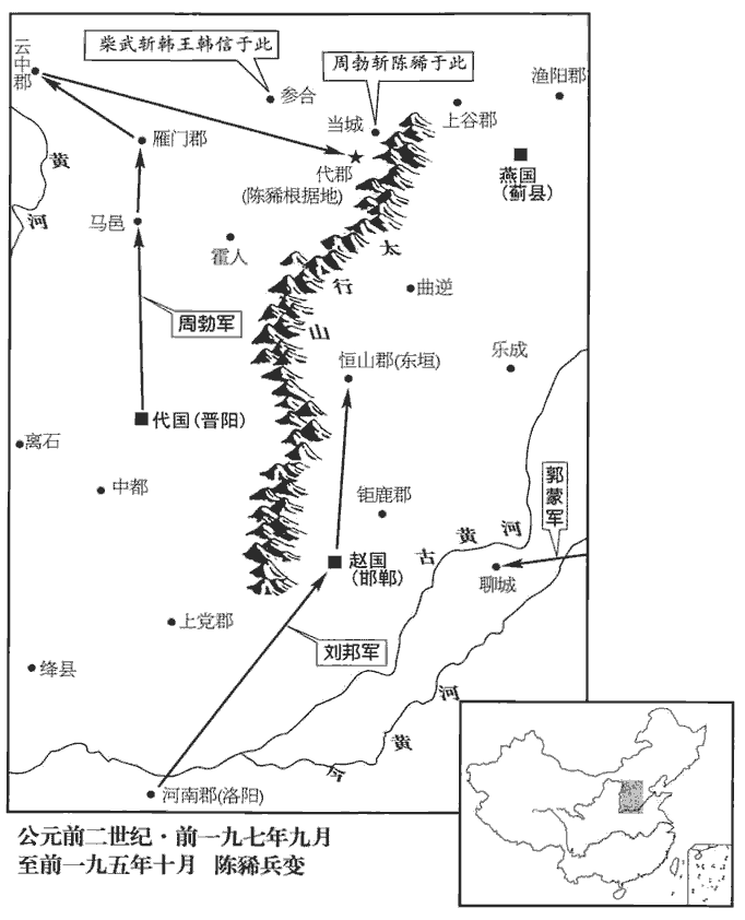 1冬,上‹时年六十一›在邯鄲。陳豨將侯敞將萬餘人遊行,王黃將騎千余軍曲逆‹河北顺平›,張春將卒萬餘人渡河攻聊城‹山東聊城›;班志,聊城縣屬東郡。括地志:聊城故城,在博州聊城縣西二十里,春秋時齊之西界。聊,攝也。戰國時亦為齊地。漢將軍郭蒙與齊將擊,大破之。太尉周勃道太原‹山西太原›入定代地,至馬邑‹山西朔縣›,不下,攻殘之。殘,謂多所殺戮。趙利守東垣‹河北正定›,帝攻拔之,更命曰真定。更,工衡翻。帝購王黃、曼丘臣以千金,其麾下皆生致之。於是陳豨軍遂敗。