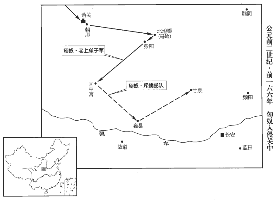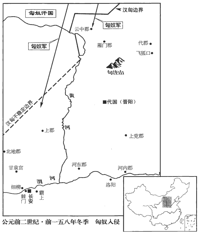 1冬,匈奴‹王庭设蒙古哈尔和林›老上單于十四萬騎入朝那‹宁夏彭阳西古城乡›、蕭關‹宁夏固原东南›,班志,朝那縣屬安定郡。應劭曰:史記,故戎那邑也。蕭關在朝那界,唐屬原州之境,後置蕭關縣,為武州治所。史記正義曰:蕭關,今古隴山關,在原州平涼縣界。殺北地‹甘肅西峰›都尉卬,徐廣曰:卬,姓段。師古曰:非也,姓孫。卬,五郎翻。虜人民畜產甚多;遂至彭陽‹甘肅鎮原›,使奇兵入燒回中宮‹陝西陇县西北›,候騎至雍‹陕西凤翔›、甘泉‹陝西淳化西北›。班志,彭陽縣屬安定郡。師古曰:即今彭原縣。括地志:彭陽縣故城,在今涇州臨涇縣東二十里彭原。寧州雍縣,班志屬扶風。騎,奇寄翻;下同。帝‹刘恒,时年三十七›以中尉周舍、郎中令張武為將軍,發車千乘、乘,繩證翻。騎卒十萬軍長安旁,以備胡寇;而拜昌侯盧卿為上郡‹陝西延安›將軍,寧侯魏遫chì為北地‹甘肅西峰›將軍,隆慮侯周竈為隴西‹甘肅臨洮›將軍,屯三郡。昌侯「盧卿」,功臣表作「旅卿」,古字借用也。姓譜:姜姓之後封于盧,以國為氏,與寧侯、隆慮侯皆高祖功臣。昌侯國屬琅邪郡。寧侯國在河內修武縣界。隆慮侯國亦屬河內郡。三人分屯三郡,故各以郡為將軍號。遫,古速字。上親勞軍,勒兵,申教令,賜吏卒,自欲征匈奴。群臣諫,不聽;皇太后固要,上乃止。勞,力到翻。文穎曰:要,劫也,哀痛祝誓之言。余謂固要,力止也。要,讀曰邀。康力笑翻,非也。於是以東陽侯張相如為大將軍,成侯董赤、成侯董赤,高帝功臣董渫xiè之子。成侯國屬涿郡。赤,史記正義音赫。內史欒布皆為將軍,擊匈奴。單于留塞內月餘,乃去。漢逐出塞即還,不能有所殺。