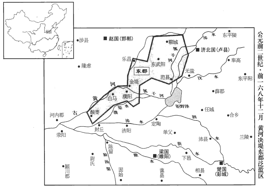 1冬,十二月,河決酸棗‹河南延津›,東潰金堤‹一名千里堤,河南濮阳南›、東郡‹河南濮陽西南›;大興卒塞之。班志,酸棗縣屬陳留郡。師古曰:金堤在東郡白馬界,今滑州。括地志:金堤,一名千里堤,在白馬縣東五里。余據河堤自汴口以東,緣河積石為堰,通河古口,咸曰金堤。又水經註:濮陽縣故城在河南,與衛縣分水;城北十里有瓠hù河口,有金堤。塞,悉則翻。