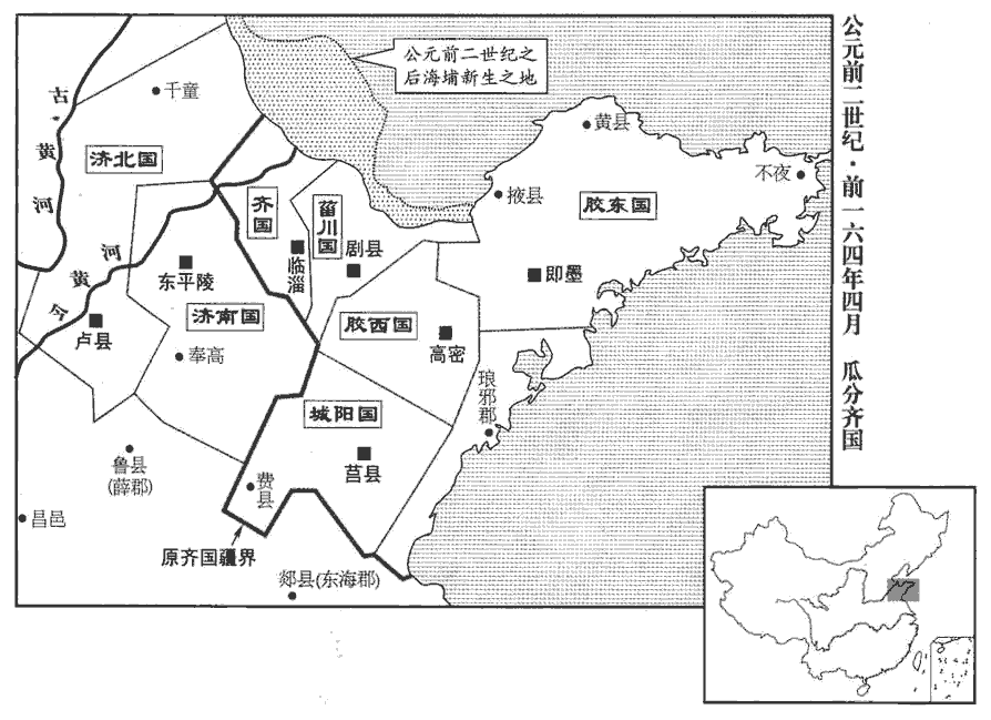 2徙淮南‹府寿春,安徽寿县›王喜復為城陽‹府莒县,山东莒县›王。又分齊為六國;丙寅‹十七›,立齊悼惠王子在者六人:楊虛侯將閭為齊王‹府临淄,山東淄博东临淄镇›,安都侯志為濟北王‹府卢县,山東長清›,武成侯賢為菑川王‹府剧县,山东寿光南›,白石侯雄渠為膠東王‹府即墨,山東平度›,平昌侯卬為膠西王‹府高密,山東高密›,扐lì侯辟光為濟南王‹府东平陵,山东章丘›。淮南厲王子在者三人:阜陵侯安為淮南王‹府寿春,安徽壽縣›,安陽侯勃為衡山王‹府邾县,湖北黄州›,陽周侯賜為廬江王‹府番阳,江西波阳›。十一年,徙城陽王喜王淮南,今復其舊;將復以淮南地分王厲王三子安、勃、賜也。楊虛,據水經,河水過楊虛縣;註引地理志曰:楊虛,平原之隸縣也,城在高唐之西南;而班志無此縣,不知酈道元所謂志者何志也。史記正義曰:安都故城,在瀛州高陽縣西南三十九里。濟北王,都盧。「武成」,史記作「武城」。索隱曰:武城縣屬平原。正義曰:貝州縣。菑川王,都劇。班志,金城郡有白石縣。正義曰:白石故城,在德州安德縣北二十里。膠東王,都即墨。班志,平昌,侯國,屬平原郡。膠西王,都高苑。扐lì‹山东省商河县›,侯國,屬平原郡。濟南王,都東平陵。阜陵縣屬九江郡。淮南王,都壽春。安陽屬汝南郡。衡山王,都六。陽周縣屬上郡。廬江王,都江南。濟,子禮翻。扐,音力。
