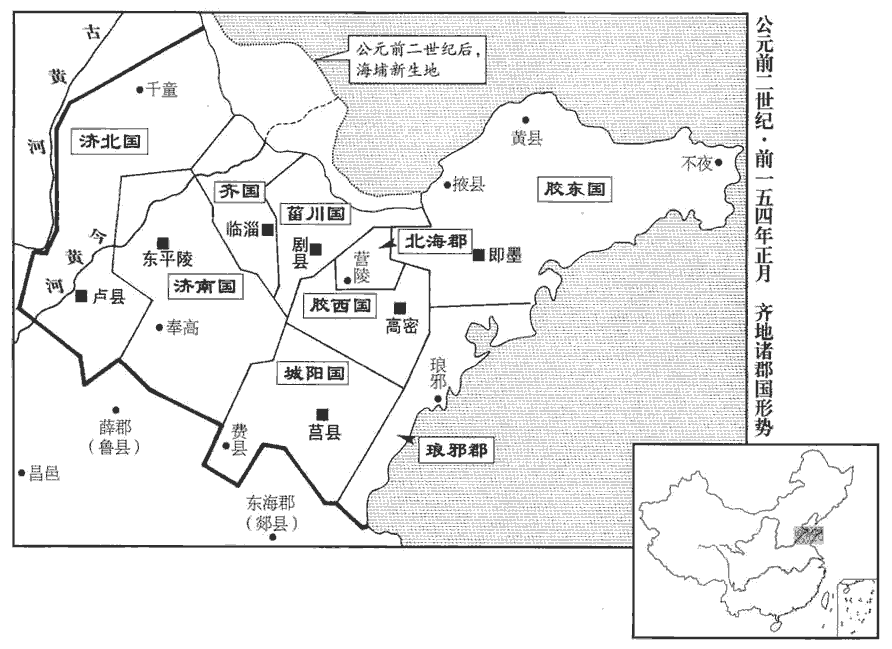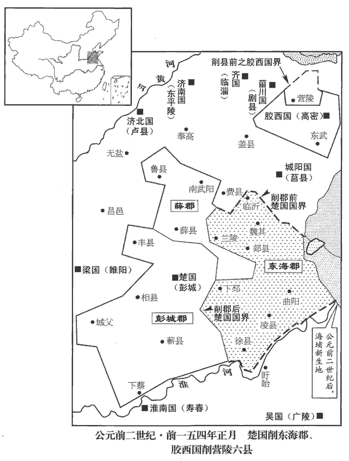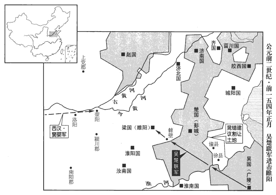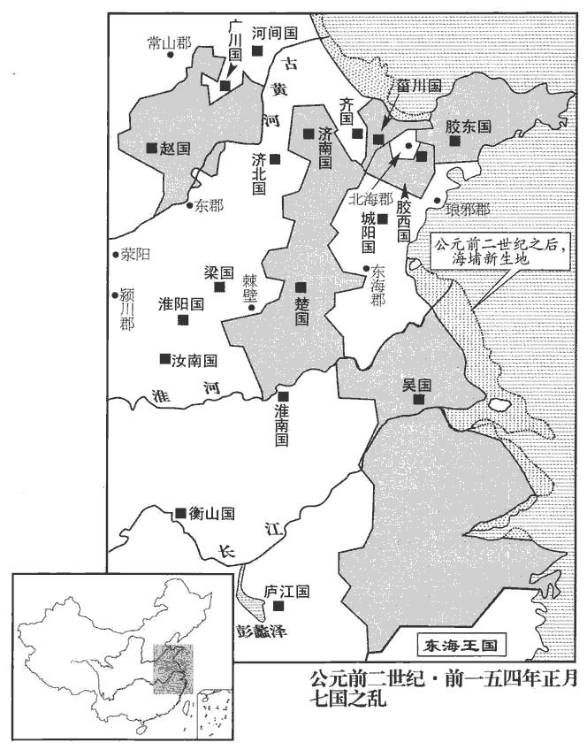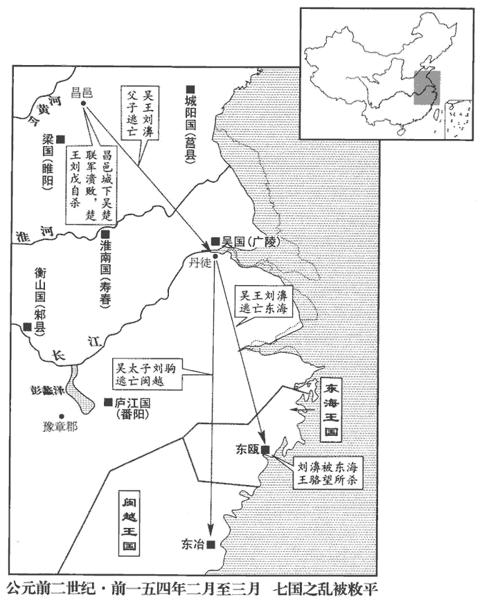 及削吳會稽‹江蘇蘇州›、豫章郡‹鄣郡,浙江安吉北›書至,吳王遂先起兵,誅漢吏二千石以下;膠西、膠東、菑川、濟南、楚、趙亦皆反。楚相張尚、太傅趙夷吾諫王戊,戊殺尚、夷吾。趙相建德、內史王悍諫王遂,遂燒殺建德、悍。悍,下罕翻,又侯旰翻。齊王後悔,背約城守。背,蒲妹翻。守,式又翻。濟北‹首府盧县,山東長清›王城壞未完,其郎中令劫守,王不得發兵。膠西王、膠東王為渠率,師古曰:渠,大也。率,所類翻。與菑川、濟南共攻齊,圍臨菑‹山東臨淄›。臨菑,齊都。趙王遂發兵住其西界,欲待吳、楚俱進,北使匈奴與連兵。使,疏吏翻;下同。