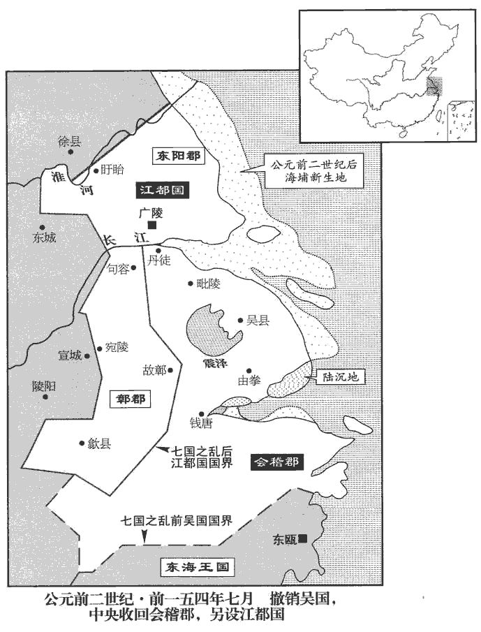 帝欲以吳王弟德哀侯廣之子續吳,以楚元王子禮續楚,德,哀侯廣之子,即德侯通也。禮時封平陸侯,為宗正。竇太后曰:「吳王,老人也,宜為宗室順善,今乃首率七國,紛亂天下,奈何續其後?」不許吳,許立楚後。乙亥‹二十四›,徙淮陽‹河南淮阳›王馀為魯‹山東曲阜›王,汝南王非為江都‹江蘇揚州›王,王故吳地。立宗正禮為楚‹江蘇徐州›王,立皇子端為膠西王,勝為中山王。中山王,都盧奴‹河北定州›。