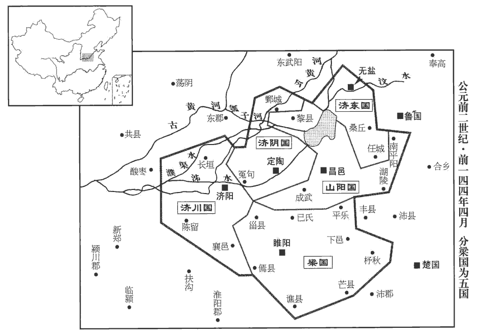 5夏,四月,梁孝王薨。竇太后聞之,哭極哀,不食,曰:「帝果殺吾子!」帝哀懼,不知所為;與長公主計之,乃分梁為五國,盡立孝王男五人為王:買為梁王‹首府睢陽,河南商丘›,明為濟川王‹首府济阳,河南兰考东北堌阳镇›,彭離為濟東王‹首府无盐,山東東平东南›,定為山陽王‹首府昌邑,山东金乡西北昌邑镇›,不識為濟陰王‹首府定陶,山東定陶›;梁仍都睢陽。濟川國在陳留、東郡之間。濟東國後入漢為大河郡,後又為東平國。山陽國即山陽郡。濟陰國即濟陰郡。濟,子禮翻。女五人皆食湯沐邑。奏之太后,太后乃說,為帝加一餐。說,讀曰悅。為,於偽翻。孝王未死時,財以巨萬計,及死,藏府余黃金尚四十余萬斤,藏,徂浪翻。他物稱是。稱,尺證翻。