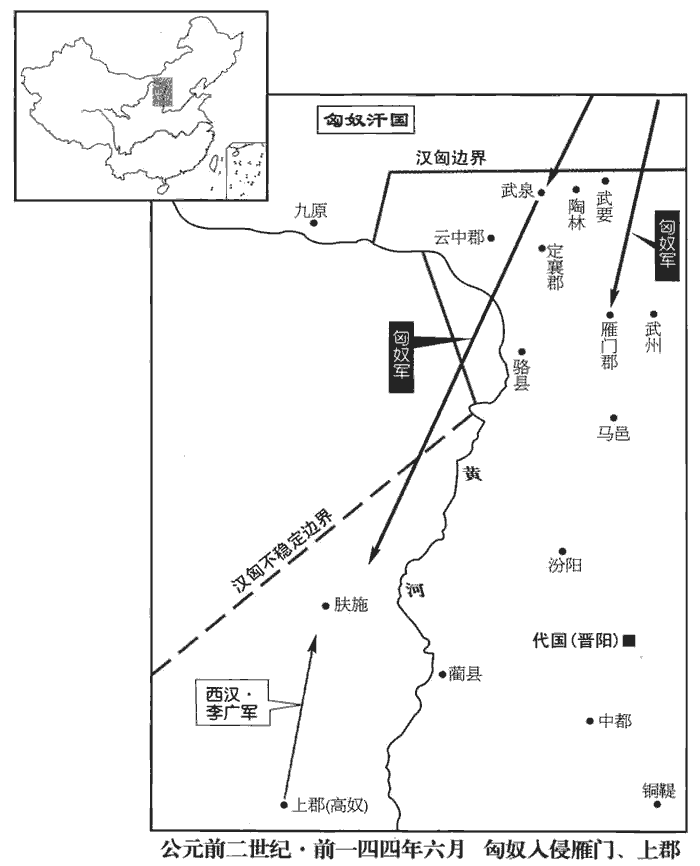 7六月,匈奴‹王庭设蒙古哈尔和林›入雁門‹山西右玉›,至武泉‹內蒙呼和浩特东北›,入上郡‹陝西延安›,取苑馬;雁門有句注之險。如淳曰:漢儀注:太僕牧師諸苑三十六所,分佈北邊、西邊,以郎為苑監,官奴婢三萬人,養馬三十萬匹。師古曰:武泉,雲中縣也。養鳥獸通名曰苑,故謂牧馬處曰苑。食貨志:景帝始造苑馬以廣用。吏卒戰死者二千人。隴西‹甘肃临洮›李廣為上郡太守,嘗從百騎出,【章:甲十五行本「出」下有「卒」字;乙十一行本同;張校同。】遇匈奴數千騎,見廣,以為誘騎,誘騎者,見少以誘敵。誘,音酉;下同。皆驚,上山陳。師古曰:為陳以待廣也。陳,讀曰陣;下同。廣之百騎皆大恐,欲馳還走。廣曰:「吾去大軍數十里,今如此以百騎走,匈奴追射我立盡。射,而亦翻;下同。今我留,匈奴必以我為大軍之誘,必不敢擊我。」廣令諸騎曰:「前!」未到匈奴陣二里所,止,令曰:「皆下馬解鞍!」其騎曰:「虜多且近,即有急,柰何?」廣曰:「彼虜以我為走;令【章:乙十一行本「令」作「今」;孔本同;熊校同。】皆解鞍以示不走,用堅其意。」師古曰:示以堅牢,令敵意知之。於是胡騎遂不敢擊。有白馬將出,護其兵;師古曰:將之乘白馬者也。護,謂監視之。將,即亮翻。李廣上馬,與十餘騎奔,射殺白馬將而復還,至其騎中解鞍,令士皆縱馬臥。是時會暮,胡兵終怪之,不敢擊。夜半時,胡兵亦以為漢有伏軍於旁,欲夜取之,胡皆引兵而去。平旦,李廣乃歸其大軍。