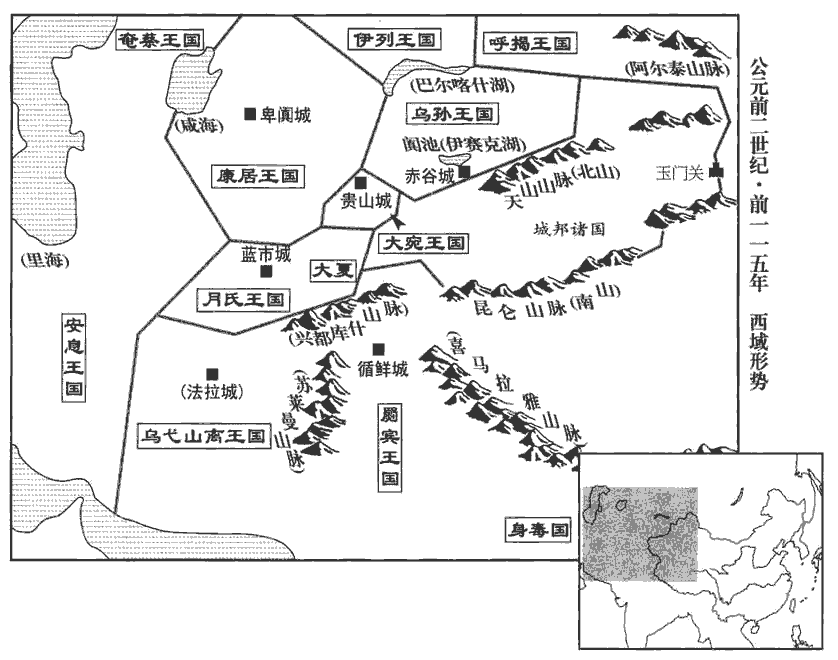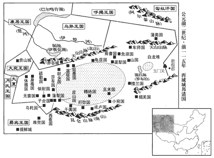 西域凡三十六國,南北有大山‹南崑崙山北天山›,中央有河‹塔里木河›,西域始通於漢凡三十六國,其後分置五十余國:婼羌‹新疆若羌东南阿尔金山南麓›、鄯善‹即楼兰,新疆若羌›、且末‹新疆且末›、小宛‹新疆且末南八十公里›、精絕‹新疆民丰北一百四十公里›、戎盧‹新疆民丰南五十公里›、扜yū彌‹新疆于田›、渠勒‹新疆于田南八十公里›、皮山‹新疆皮山›、烏秅chá‹新疆塔什库尔干西南叶尔羌河上游›、西夜‹新疆叶城南七十公里›、蒲犁‹新疆莎车西南艾塞勒巴格›、子合‹新疆叶城西南七十公里›、依耐‹新疆塔什库尔干东南布伦木沙›、無雷‹葱岭,帕米尔高原上›、難兜‹克什米尔北部吉尔吉特东南›、罽jì賓‹巴基斯坦伊斯兰堡西北塔克西拉›、烏弋山離‹阿富汗兴都库什山西南›、犁鞬‹即黎轩国,托勒密王朝埃及›、條支‹塞琉古王朝叙利亚›、安息‹伊朗›、大月氏‹都蓝市城,阿富汗北部瓦齐拉巴德›、大夏‹阿富汗东北部›、康居‹都卑阗城,巴爾喀什湖西南锡尔河北岸突厥斯坦›、奄蔡‹里海北岸与咸海北岸之间›、大宛‹都贵山城,中亚纳曼干市西北卡散塞城›、桃槐‹中亚安集延市东南›、休循‹中亚吉尔吉斯共和国萨雷塔什城›、捐篤‹新疆乌恰县西一百公里吉根城›、莎車‹新疆莎车›、疏勒‹新疆喀什›、尉頭‹新疆阿合奇县西南哈拉奇城›、烏孫‹都赤谷城,伊塞克湖东南›、姑墨‹新疆阿克苏›、溫宿‹新疆乌什›、龜茲‹新疆库车›、烏壘‹新疆轮台东北六十公里›、渠犁‹新疆库尔勒西南›、尉犁‹新疆博湖县›、危須‹新疆和硕›、焉耆‹新疆焉耆›、烏貪訾zī離‹新疆呼图壁县›、卑陸‹新疆阜康›、卑陸後國‹新疆阜康西›、郁立師‹新疆吉木萨尔县西›、單桓‹新疆昌吉›、蒲類‹新疆巴里坤县›、蒲類後國‹新疆巴里坤西一百三十公里›、西且彌‹新疆呼图壁西南›、東且彌‹新疆昌吉西南›、劫國‹新疆阜康西›、山國‹新疆托克逊南破城子›、狐胡‹新疆吐鲁番西北›、車師前‹新疆吐鲁番›、後王‹新疆吉木萨尔县南›是也。南北有大山者,南山在于窴tián之南、東出金城,與漢南山接;北山在車師之北,即唐志所謂西州交河縣北柳谷金沙嶺等山是也。中央有河者,河有兩源,一出蔥嶺,一出于窴南山,其河北流與蔥嶺河合,注蒲昌海。自于窴以西,水皆西流,逕休循、罽賓、大月氏、安息等國而入於西海。蒲昌之水潛行地下,南出積石,為中國河。西海之水東南合於交州漲海。東西六千餘里,南北千餘里,東則接漢玉門‹甘肃敦煌西北›、陽關‹甘肃敦煌西南›,班志:敦煌郡龍勒縣有玉門關、陽關,酒泉郡有玉門縣。闞駰曰:漢罷玉門關屯,置其人於此。括地志:沙州龍勒山,在縣南百六十五里,玉門關,在縣西北百一十八里。西則限以蔥嶺‹帕米尔高原›。西河舊事:蔥嶺,其山高大,上悉生蔥,故以名焉。河有兩源,一出蔥嶺‹叶尔羌河›,一出于窴‹和田河›。【章:十四行本「窴」作「闐」;乙十一行本同;孔本同。】合流東注鹽澤‹羅布泊›。鹽澤去玉門、陽關三百餘里。自玉門、陽關出西域有兩道:從鄯善‹樓蘭,新疆若羌›傍南山北,循河西行至莎車,為南道;鄯善,亦曰樓蘭國,治杅yú尼城,去陽關千六百里。鄯,上扇翻。傍,步浪翻。莎車,治莎車城,去長安九千九百五十里。莎,素河翻。南道西逾蔥嶺,則出大月氏、安息。自車師前王廷隨北山循河西行至疏勒,為北道;車師前王,治交河城,去長安八千一百五十里,唐西州交河縣是也。疏勒,治疏勒城,去長安九千三百五十里,西當大月氏、大宛、康居之道。北道西逾蔥嶺,則出大宛、康居、奄蔡焉。杜佑曰:奄蔡,後為肅粟特國。故皆役屬匈奴,匈奴西邊日逐王,置僮僕都尉,匈奴蓋以僮僕視西域諸國,故以名官。使領西域,常居焉耆、危須、尉黎間,焉耆,治員渠城,去長安七千三百里。危須,治危須城,在焉耆東百里,去長安七千二百九十里。尉犁,治尉犁城,去長安六千七百五十里,南接鄯善、且末二國。賦稅諸國,取富給焉。