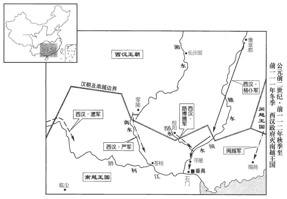 5秋,遣伏波將軍路博德環濟要略曰:伏波將軍者,船涉江海,欲使波濤伏息也。出桂陽‹廣東連縣›,下湟水;水經:匯水出桂陽縣盧聚,南出貞女峽,合洭水,東南過含洭縣,南出洭浦關為桂水。山海經以洭水為湟水。徐廣曰:湟水,一名洭水,出桂陽,通四會。師古曰:湟,音皇。樓船將軍楊僕出豫章‹江西南昌›,下湞水‹即滃江›;應劭曰:湞水出南海龍川西,入秦水。水經:湞水逕桂陽郡之湞陽縣南,而右注溱水。湞,鄭氏曰:湞,音檉chēng;孟康曰:湞,音貞;師古曰:湞,丈庚翻。歸義越侯嚴為戈船將軍,出零陵‹廣西全州縣›,下離水;張晏曰:嚴故越人,降,為歸義侯。越人于水中負人船,又有蛟龍之害,故置戈於船下,因以為名。臣瓚曰:伍子胥書有戈船,以載干戈,因謂之戈船也。師古曰:以樓船之例言之,非謂載干戈也,此蓋船下安戈以禦蛟鼉水蟲之害,張說近之。貢父曰:船下安戈既難措置,又不可以行;今造舟船甚多,未嘗有置戈者。顏北人,不曉行船,故信張說;蓋瓚說是。余據表無歸義越侯嚴。零陵本屬桂陽,帝分置郡;唐為永、道二州。漓水,班志:出零陵縣陽海山東南,至廣信入郁水。甲為下瀨將軍,下蒼梧;服虔曰:甲故越人歸漢者。臣瓚曰:瀨,湍也;吳、越謂之瀨,中國謂之磧。伍子胥書有下瀨船。瀨,音賴。蒼梧本越地,帝始置郡,有漓水關;唐梧、賀、康、端、封之地。皆將罪人,江、淮以南樓船十萬人。越馳義侯遺別將巴、蜀罪人,發夜郎‹貴州关岭›兵,下牂柯江,咸會番禺‹廣東廣州›。