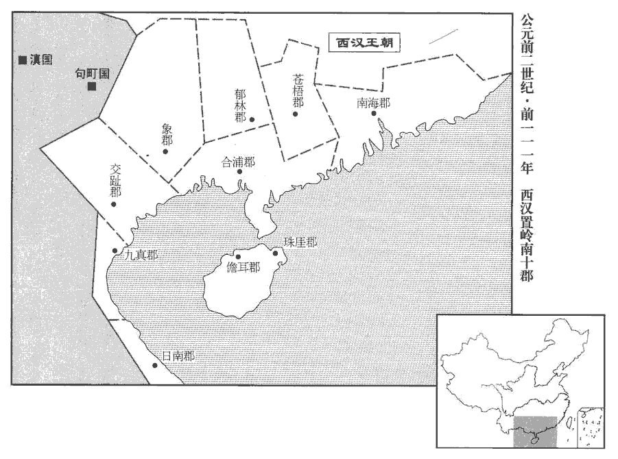2樓船將軍楊僕入越地,先陷尋陿xiá‹廣東清远东›,陿,作陝音。姚氏曰:尋陿在始興西三百里,近連口也。陿,音狹。破石門,石門在番禺‹廣州›西北二十里。郡國志:呂嘉拒漢,積石江中為門,因名石門。挫越鋒,以數萬人待伏波將軍路博德至,俱進,樓船居前,至番禺‹廣東廣州›。南越王建德、相呂嘉城守。樓船居東南面,伏波居西北面。會暮,樓船攻敗越人,縱火燒城。敗,蒲賣翻。伏波為營,師古曰:設營壘以待降者。遣使者招降者,賜印綬,復縱令相招。師古曰:來降者即賜以侯印,而放令還,更相招諭。復,扶又翻。樓船力攻燒敵,驅而入伏波營中。黎旦,城中皆降。建德、嘉已夜亡入海,伏波遣人追之。校尉司馬蘇弘得建德,越郎都稽得嘉。孟康曰:越中所自置郎也。考異曰:史記漢書表皆作「孫都」,南越傳皆云「都稽」,今從傳。戈船、下瀨將軍兵及馳義侯所發夜郎兵未下,南越已平矣。遂以其地為南海‹廣東廣州›、蒼梧‹廣西梧州›、鬱林‹廣西桂平›、合浦‹广西合浦东北›、交趾‹越南河內›、九真‹越南清化›、日南‹越南东河›、珠厓‹海南島瓊山›、儋dān耳‹海南島儋州›九郡。南海,唐廣州、循州之地。蒼梧,註見上。鬱林,唐桂州、鬱林、黨、繡州之地。合浦,唐廉、雷、潘州之地。交趾,唐安南之地。杜佑曰:南方夷人,其足大,指開廣;若并足而立,其指交,故名交趾。劉欣期交州記曰:交趾之人出南定縣,足骨無節,身有毛,臥者更扶乃得起。山海經:交脛jìng國為人交脛。郭璞曰:腳脛曲戾相交,所謂「雕題、交趾」也。九真,唐愛州之地。日南,唐驩州之地。師古曰:言其在日之南,所謂開北戶以向日者。珠厓、儋耳,唐瓊管之地。應劭曰:二郡在大海厓岸之邊,出真珠,故曰珠厓。儋耳者,種大耳,其渠率自謂王者,耳尤緩,下肩三寸。張晏曰:異物志,二郡在海中,東西千里,南北五百里。儋耳之人,鏤其頰皮,上連耳匡,分為數支,狀如羊腸,累耳而下垂。賢曰:儋耳故城,即今儋州義倫縣。儋,丁甘翻。臣瓚曰:珠厓郡治瞫shěn都,去長安七千三百二十四里,儋耳去長安七千三百三十五里,見茂陵書。師還,上益封伏波;封樓船為將梁侯,蘇弘為海常侯,都稽為臨蔡侯,徐廣曰:海常在東萊。余以王子侯表參考,則海常侯當食邑琅邪。功臣表,臨蔡侯食邑河內。及越降將蒼梧王趙光等四人皆為侯。趙光封隨桃侯,史定封安道侯,畢取封膫侯,居翁封湘城侯。考異曰:凡此等封侯者,年表皆有月日,為其先後難齊,故盡附于立功之處;後仿此。