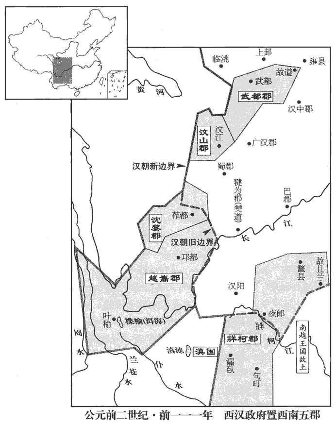 5馳義侯發南夷兵,欲以擊南越。且蘭‹貴州福泉›君恐遠行且蘭亦南夷種,帝開為縣,屬牂柯郡。且,音苴;子閭翻。旁國虜其老弱,乃與其眾反,殺使者及犍為‹贵州遵义›太守。犍,渠延翻。守,式又翻。漢乃發巴、蜀罪人當【嚴:「當」改「嘗」。】擊南越者八校尉,遣中郎將郭昌、衛廣將而擊之,將,即亮翻。誅且蘭‹貴州福泉›及邛‹四川西昌›君、莋zuó‹四川漢源›侯,邛君,邛都之君。莋侯,莋都之君。莋,才各翻;下同。遂平南夷為牂【章:十四行本「牂」作「䍧」;乙十一行本同。】柯郡‹貴州福泉›。夜郎‹貴州关岭›侯始倚南越,南越已滅,夜郎遂入朝,朝,直遙翻。上以為夜郎王。冉、駹máng‹四川松潘北›皆振恐,請臣置吏,乃以邛都‹四川西昌›為越巂郡,邛,渠容翻。越巂郡,唐為巂州。巂,音髓。莋都‹四川漢源›為沈黎郡,服虔曰:今蜀郡北部都尉所治本莋都。臣瓚曰:茂陵書,沈黎治莋都,去長安三千三百三十五里。唐為黎州地。冉、駹máng‹四川松潘北›為汶山郡,駹,莫江翻。應劭曰:今蜀郡岷山本冉駹地。宣帝地節四年,省岷山郡并蜀,今茂州諸羌之地是也。華陽國志:汶山,南接漢嘉,西接涼州酒泉,北接陰平,皆其地也。唐置茂州汶山縣。註云,有岷山。類篇:汶,音「岷」。又據史記夏紀引禹貢「岷、嶓bō既藝」及「岷山之陽」及「岷山導江」之岷皆作「汶」,蓋漢時古字通用也。康曰汶,音問,非也。廣漢西白馬‹甘肅西和西南›為武都郡。高祖置廣漢郡;唐為梓州。白馬居武都仇池,班志所謂天池大澤。括地志:隴右成州、武州皆白馬氐,其豪族楊氏居成州仇池山上。武都郡,唐階、成、武等州地。