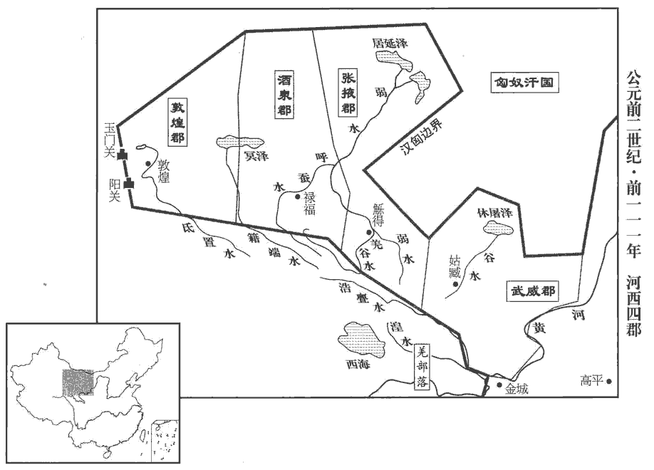 烏孫王既不肯東還,漢乃于渾邪王故地置酒泉郡‹甘肅酒泉›,應劭曰:其水如酒,故曰酒泉。師古曰:城下有金泉,泉味如酒;唐為肅州。宋白曰:東南至長安二千九百里。稍發徙民以充實之;後又分置武威郡‹甘肅武威›,本匈奴休屠王所居地,太初四年分置武威郡,唐之涼州即其地。宋白曰:東南至長安二千八百里。以絕匈奴與羌通之道。