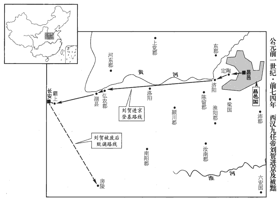 王‹刘贺›到霸上‹陝西西安东灞河畔›,大鴻臚郊迎,臚,陵如翻。騶奉乘輿車。王使壽成御,壽成,人名,昌邑太僕也。乘,繩證翻;下同。郎中令遂參乘。且至廣明、東都門,遂曰:「禮,奔喪望見國都哭。此長安東郭門也。」廣明註見上卷元鳳元年。三輔黃圖:宣平門,長安城東出北頭第一門;其外郭名東都門。王曰:「我嗌yì痛,不能哭。」師古曰:嗌,喉咽也,音益。至城門,遂復言;復,扶又翻。王曰:「城門與郭門等耳。」且至未央宮東闕,遂曰:「昌邑帳在是闕外馳道北,文穎曰:吊哭帳也。未至帳所,有南北行道,馬足未至數步;大王宜下車,鄉闕西面伏哭,盡哀止。」鄉,讀曰嚮。王曰:「諾。」到,哭如儀。六月,丙寅‹一›,王‹刘贺›受皇帝璽綬,襲尊號;璽,斯氏翻。綬,音受。尊皇后曰皇太后‹时年十五›。