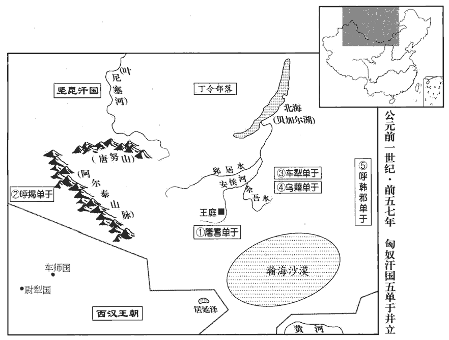 6匈奴握衍朐鞮單于暴虐,好殺伐,好,呼到翻。國中不附。及太子、左賢王數讒左地貴人,左地貴人,謂左谷蠡王以下至左大當戶統兵者也。數,所角翻。左地貴人皆怨。會烏桓‹内蒙西辽河上游›擊匈奴東邊姑夕王,頗得人民,單于怒。姑夕王怨,即與烏禪幕及左地貴人共立稽侯狦shān為呼韓邪單于,狦,先安翻,又所奸翻。發左地兵四五萬人,西擊握衍朐鞮單于,至姑且水北。師古曰:且,音子餘翻。未戰,握衍朐鞮單于兵敗走,使人報其弟右賢王曰:「匈奴共攻我,若肯發兵助我乎?」師古曰:若,汝也;此下亦同。右賢王曰:「若不愛人,殺昆弟、諸貴人。各自死若處,無來汙我!」師古曰:言于汝所居處自死。汙,烏故翻。握衍朐鞮單于恚,自殺。恚,於避翻。左大且渠都隆奇亡之右賢王所,都隆奇,本立握衍朐鞮單于,故亡。且,子餘翻。其民盡降呼韓邪單于。降,戶江翻。呼韓【章:甲十五行本「韓」下有「邪」字;乙十一行本同;孔本同。】單于歸庭;數月,罷兵,使各歸故地,乃收其兄呼屠吾斯在民間者,立為左谷蠡王,谷,音鹿。蠡,盧奚翻;下同。使人告右賢貴人,欲令殺右賢王。其冬,都隆奇與右賢王共立日逐王薄胥堂為屠耆單于,發兵數萬人東襲呼韓邪單于,呼韓邪單于兵敗走。屠耆單于還,以其長子都塗吾西為左谷蠡王,少子姑瞀mào樓頭為右谷蠡王,留居單于庭‹蒙古哈尔和林›。屠耆使二子守單于庭,而身西還也。師古曰:瞀,音莫構翻。