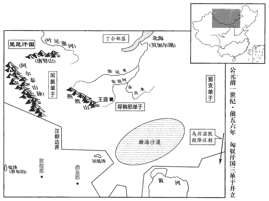 2匈奴呼韓邪單于來朝,贊謁稱藩臣而不名;賜以冠帶、衣裳,黃金璽、盭lì綬,白虎通:衣者,隱也;裳者,障也;所以隱形自障蔽也。璽,斯氏翻。綬,音受。師古曰:盭,古戾字。戾,草名也。以戾染綬,亦諸侯王之制也。玉具劍、佩刀,弓一張,矢四發,孟康曰:玉具劍,摽biào首、鐔xín、衛盡用玉為之也。師古曰:鐔xín,劍口旁橫出者也。衛,劍鼻也。鐔,音淫。「衛」字本作「璏zhì」,其音同耳。服虔曰:發,十二矢也。韋昭曰:射禮,三而止,每射四矢,故以十二為一發也。師古曰:發,猶今言箭一放、兩放也。今則以一矢為一放也。棨qǐ戟十,師古曰:棨,有衣之戟也。棨,音啟。安車一乘,鞍勒一具,師古曰:勒,馬轡也。馬十五匹,黃金二十斤,錢二十萬,衣被七十七襲,師古曰:一稱為一襲,猶今人之言一副衣服也。錦繡、綺縠hú、雜帛八千匹,絮六千斤。禮畢,使使者道單于先行宿長平。師古曰:道,讀曰導,導引也。如淳曰:長平,阪名也,在池陽南。上原之阪有長平觀,去長安五十里。師古曰:涇水之南原,即今所謂睚yá城阪也。上自甘泉宿池陽宮‹陝西涇陽西北›。池陽縣屬左馮翊,有離宮在焉。賢曰:池陽縣故城,在今涇陽縣西北。上登長平阪,詔單于毋謁,師古曰:不令拜也。其左、右當戶【章:甲十五行本「戶」下有「羣臣」二字;乙十一行本同;孔本同。】皆得列觀,及諸蠻夷君長、王、侯數萬,咸迎於渭橋下,夾道陳。陳,如字,陳列也,又塗也。上登渭橋,咸稱萬歲。單于就邸長安。置酒建章宮,饗賜單于,觀以珍寶。師古曰:觀,示也。觀,古玩翻。二月,遣單于歸國。單于自請「願留居幕南光祿塞下‹内蒙包头境›;師古曰:徐自為所築者也。余按武帝遣光祿徐自為出五原塞,築亭障列城,後人因謂之光祿塞。有急,保漢受降城。」‹内蒙乌拉特中旗东五十公里新忽热›恐郅支來攻,故請有急入城自保。漢遣長樂衛尉、高昌侯董忠、功臣表,高昌侯食邑於千乘。樂,音洛。車騎都尉韓昌將騎萬六千,又發邊郡士馬以千數,送單于出朔方雞鹿塞‹內蒙磴口西北七十公里›。師古曰:雞鹿塞,在朔方寙yǔ渾縣之西北。詔忠等留衛單于,助誅不服,又轉邊穀米糒bèi,師古曰:糒,乾飯也,音備。前後三萬四千斛,給贍其食。先是,自烏孫‹中亚伊塞克湖东南›以西至安息‹伊朗›諸國近匈奴者,皆畏匈奴而輕漢;先,悉薦翻。近,其靳翻。及呼韓邪【章:甲十五行本「邪」下有「單于」二字;乙十一行本同;孔本同。】朝漢後,咸尊漢矣。