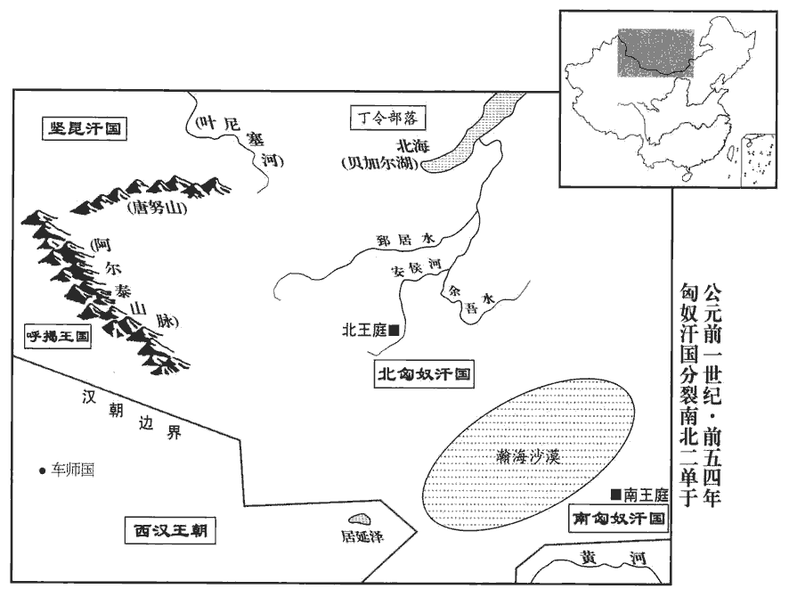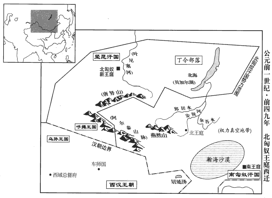 2匈奴呼韓邪單于‹王庭设内蒙阴山北›來朝;二月,歸國。始,郅支單于‹王庭设蒙古哈尔和林›以為呼韓邪兵弱,降漢,不能復自還,復,扶又翻。即引其眾西,欲攻定右地。又屠耆單于小弟本侍呼韓邪,亦亡之右地,收兩兄余兵,兩兄,屠耆、閏振也。得數千人,自立為伊利目單于;「目」,漢書作「自」。道逢郅支,合戰,郅支殺之,并其兵五萬餘人。郅支聞漢出兵穀助呼韓邪,即遂留居右地;自度力不能定匈奴,度,徒洛翻。乃益西,近烏孫‹都赤谷城,中亚伊塞克湖东南›,近,其靳翻。欲其【章:甲十五行本「其」作「與」;乙十一行本同;張校同。】并力,遣使見小昆彌烏就屠。烏就屠殺其使,發八千騎迎郅支。郅支覺其謀,勒兵逢擊烏孫,破之;師古曰:以兵逆之,相逢即擊,故云逢擊。因北擊烏揭‹新疆阿尔泰山南麓›、堅昆‹西伯利亚叶尼塞河上游›、丁令‹貝加爾湖畔›,并三國。揭,音丘例翻。數遣兵擊烏孫,常勝之。數,所角翻。堅昆東去單于庭七千里,南至【章:甲十五行本「至」作「去」;乙十一行本同;孔本同。】車師‹吐魯番›五千里,郅支留都之。