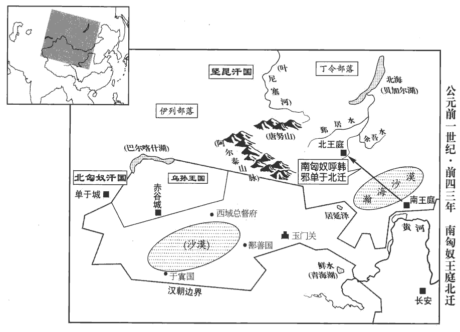 12匈奴‹南匈奴王庭设内蒙古阴山山脉北›呼韓邪單于民眾益盛,塞下禽獸盡,單于足以自衛,不畏郅支‹北匈奴单于。此时在康居首都卑阗城·中亚巴尔喀什湖西南锡尔河北岸突厥斯坦›东部国境,其大臣多勸單于北歸者。師古曰:塞下無禽獸,則射獵無所得;又不畏郅支,故欲北歸舊處。久之,單于竟北歸庭‹王庭复设于蒙古国哈尔和林市›,民眾稍稍歸之,其國遂定。