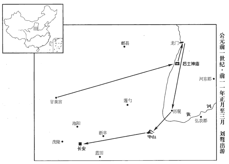 1春,正月,上‹刘骜,时年四十二›行幸甘泉‹陝西淳化西北›,郊泰畤。三月,行幸河東‹山西夏縣›,祠后土。既祭,行遊龍門‹山西河津西北龙门口›,師古曰:龍門山,在今蒲州龍門縣北。登歷觀‹山西永濟东南歷山上之廟›,晉灼曰:歷觀,在河東蒲反縣。師古曰:歷山上有觀。觀,音古玩翻。陟西嶽‹華山›而歸。陟,登也。師古曰:西嶽,華山也。