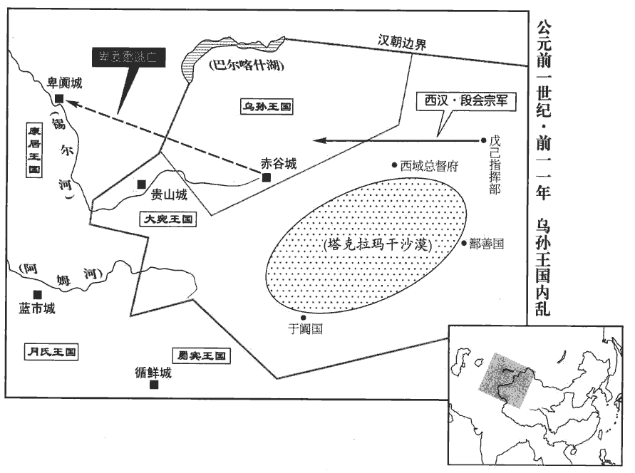 〖译文〗 [3]最初,乌孙王国小昆弥安日,被投降乌孙的人杀死,各翎侯陷于大乱。成帝下诏征召原先的金城太守段会宗为左曹、中郎将、光禄大夫,命他恢复乌孙秩序,使各方和睦。段会宗扶立安日的弟弟末振将为小昆弥,安定乌孙之后,就返回了。当时乌孙大昆弥雌栗靡勇猛剽悍,末振将害怕被他吞并,就派遣贵族乌日领诈降,乘机刺杀了雌栗靡。汉朝准备出兵讨伐,而一时未能做到,便派遣中郎将段会宗扶立解忧公主的孙子侯秩靡为大昆弥。很久之后,大昆弥和翎侯难栖杀死了末振将,让安日的儿子安犁靡代替末振将为小昆弥。汉朝悔恨没有亲自诛杀末振将,就又派遣段会宗征发戊己校尉统领的诸国兵马,前往诛杀末振将的太子番丘。段会宗恐怕大军进入乌孙,会使番丘受惊,若亡命逃跑,就找不到他了。于是让所征发的大军留驻垫娄地,仅挑选三十名精兵,人人带着弓弩,径直来到昆弥住地,召见番丘,向他谴责末振将的罪状,随即亲手举剑刺杀了番丘。番丘手下官兵惊恐万分,骑马逃奔回去,小昆弥安犁靡崐率领数千骑兵包围了段会宗。段会宗向他讲了诛杀番丘的来意,又说:“今天你们包围了并杀死我,就象拔下汉牛的一根牛毛罢了。可是大宛国王、郅支单于的人头高挂在长安街上,也是你们乌孙所知道的。”昆弥及手下人等都畏服了。小昆弥说:“末振将有负于汉朝,诛杀他的儿子是可以的,为什么偏偏不告诉我呢?也好让我为他饯别!”段会宗说:“预先告诉昆弥,你会让他逃跑藏起来,这就犯了大罪。如果你为他饯别后,再把他交给我,会伤害你们的骨肉恩情。因此没有事先告诉你。”昆弥和手下人等号哭撤兵而去。段会宗回到长安,奏报事情经过,成帝赐给段会宗关内侯的爵位,赏黄金百斤。段会宗奏告:由于难栖诛杀了末振将,请封他为坚守都尉。追究大禄、大监因不能救护雌栗靡而使他被杀的责任,收回他们的金印、紫绶,换为铜印、墨绶。末振将的弟弟卑爰,本是共谋刺杀大昆弥的主凶之一,率领部众八万人逃往北方,依附康居王国,图谋借用康居兵马兼并两昆弥。汉朝又再一次派遣段会宗,与都护孙建合力防范卑爰。