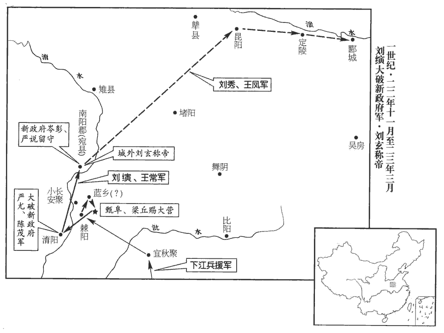 1春,正月,甲子朔‹一›,漢兵與下江兵共攻甄阜、梁丘賜,斬之,甄,之人翻。殺士卒二萬餘人。王莽納言將軍嚴尤、秩宗將軍陳茂引兵欲據宛‹河南南陽›,宛,於元翻。劉縯與戰於淯陽‹河南南陽南六十里綠楊村›下,續漢志,淯陽縣屬南陽郡。賢曰:故城在今鄧州南陽縣南淯水之陽,因名。淯,音育。大破之,遂圍宛‹河南南陽›。先是,青、徐賊眾雖數十萬人,訖無文書、號令、旌旗、部曲;師古曰:文,謂文章。號,謂大位號也。一曰:號,謂號令也。先,悉薦翻。及漢兵起,皆稱將軍,攻城略地,移書稱說。稱說者,數莽之罪也。莽聞之,始懼。