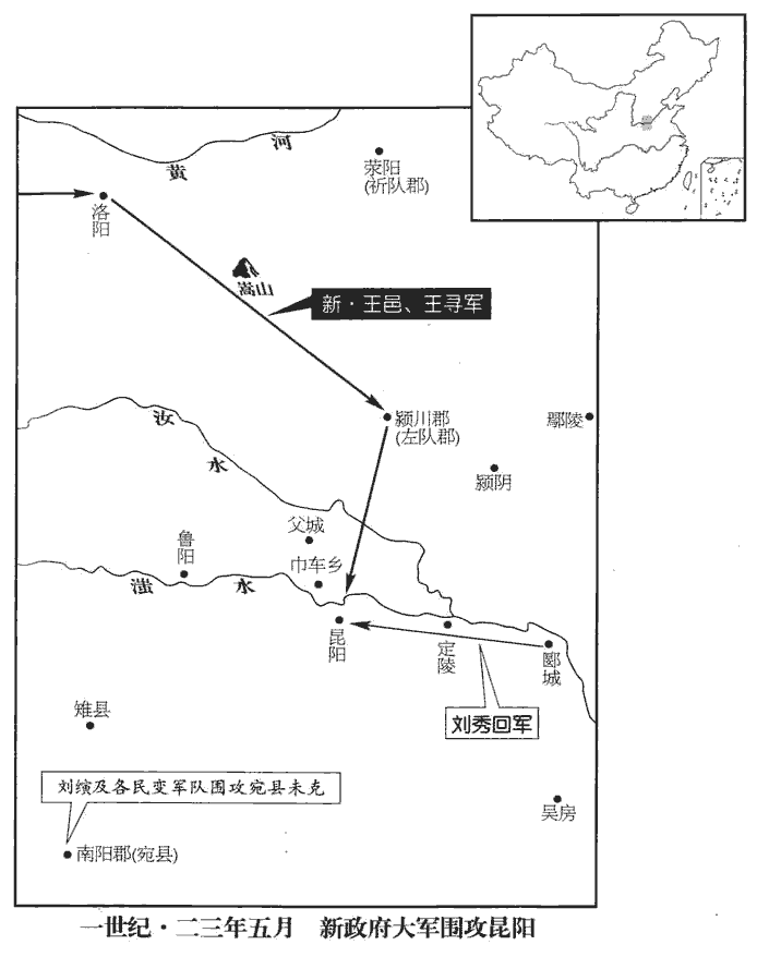 〖译文〗 [7]刘秀到了郾、定陵等地,调发各营的全部军队;将领们贪惜财物,想要分出一部分兵士留守。刘秀说:“现在如果打垮敌人,有万倍的珍宝,大功可成;如果被敌人打败,头都被杀掉了,还有什么财物!”于是征发了全部军队。六月己卯朔(初一),刘秀和各营部队一同出发,亲自带领步兵和骑兵一千多人为先头部队,在距离王莽大军四五里远的地方摆开阵势。王寻、王邑也派几千人来交战,刘秀带兵冲了过去,斩了几十人首级。将领们高兴地说:“刘将军平时看到弱小的敌军都胆怯,现在见到强敌反而英勇,太奇怪了!还是我们在前面吧,请让我们协助将军!”刘秀又向前进兵,王寻、王邑的部队退却;汉军各部一同冲杀过去,斩了数百上千个首级。汉军接连获胜,继续进兵,将领们胆气更壮,没有一个不是以一当百。刘秀就和敢于牺牲的三千人从城西水岸边攻击王莽军的主将营垒。王寻、王邑轻视汉军,亲自带领一万余人巡行军阵,戒令各营都按兵不动,单独迎上来同汉军交战,不利,大部队又不敢擅自相救;王寻、王邑所部阵乱,汉军乘机击溃敌军,终于杀了王寻。昆阳城中的汉军也击鼓大喊而冲杀出来,里应外合,呼声震天动地;王莽军大溃,逃跑者互相践踏,倒在地上的尸体遍布一百多里。适值迅雷、大风,屋瓦全都被风刮得乱飞,大雨好似从天上倒灌下来,水暴涨,虎豹都吓得发抖,掉入水中溺死的士兵上万,河水因此不能流动。王邑、严尤、陈茂等以轻骑踏着死人渡过水逃走。汉军获得王莽军抛下的全部军用物资,不可胜计,接连几个月都运不完,有些余下的就被烧掉。王莽军的士兵奔跑,各还故乡,只有王邑和他带领的长安勇士几千人回到洛阳,关中听到这个消息十分惊惧。于是海内豪杰一致响应,都杀掉当地的州郡长官,自称将军,用更始年号,等待更始皇帝的诏命;一个月之内,这种形势遍于天下。
