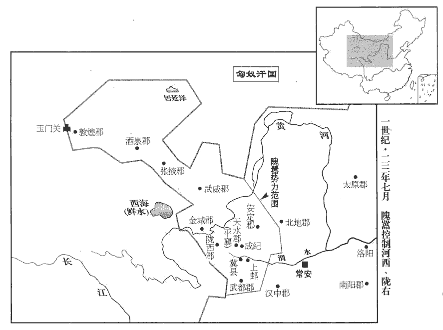 12成紀‹甘肅静宁西南›隗kuí崔、隗義、成紀縣,屬天水郡。賢曰:故城在今秦州隴城縣西北。隗姓,出於赤狄。上邽guī‹甘肅天水›楊廣、冀‹甘肅甘谷›人周宗上邽縣,屬隴西郡。賢曰:故邽戎邑,今秦州縣。冀縣,屬天水郡;秦武公伐冀戎,因縣之。宋白曰:秦州治隴城縣,即故冀城。同起兵以應漢,【章:十二行本「漢」下有「衆數千人」四字;乙十一行本同;孔本同;張校同。】攻平襄‹甘肅通渭›,殺莽鎮戎大尹李育。賢曰:平襄,縣名,屬天水郡,故城在今秦州伏羌縣西北:王莽改天水郡曰鎮戎。崔兄子囂,素有名,好經書,好,呼到翻。崔等共推為上將軍;崔為白虎將軍,義為左將軍。崔本自署右將軍;白虎居右,又起兵於西方,白虎主之,因改右將軍號白虎將軍。囂遣使聘平陵‹陝西咸陽西平陵乡›方望,以為軍師。賢曰:平陵,昭帝陵,因以為縣;故城在今咸陽縣西北。武王伐紂,以太公為師尚父;田單守即墨,以一卒為神師;韓信既破趙,師事李左車;皆軍師也。後遂以為官稱。望說囂立高廟於邑東;平襄邑‹甘肅通渭›之東也。說,輸芮翻。己巳‹二十›,祠高祖‹刘邦›、太宗‹刘恒›、世宗‹刘彻›,囂等皆稱臣執事,殺馬同盟,以興輔劉宗;移檄郡國,數莽罪惡。數,所具翻。勒兵十萬,擊殺雍州‹甘肅›牧陳慶、安定‹宁夏固原›大尹王向。莽改漢涼州曰雍州。向,平阿侯王譚之子也。考異曰:王莽傳作「卒正王旬」,袁紀作「太守王向」,今從范書。分遣諸將徇隴西‹甘肅臨洮›、武都‹甘肅西和西南蒿林乡›、金城‹甘肅永靖西北›、武威‹甘肅武威›、張掖‹甘肅張掖›、酒泉‹甘肅酒泉›、敦煌‹甘肅敦煌›,敦,徒門翻。皆下之。